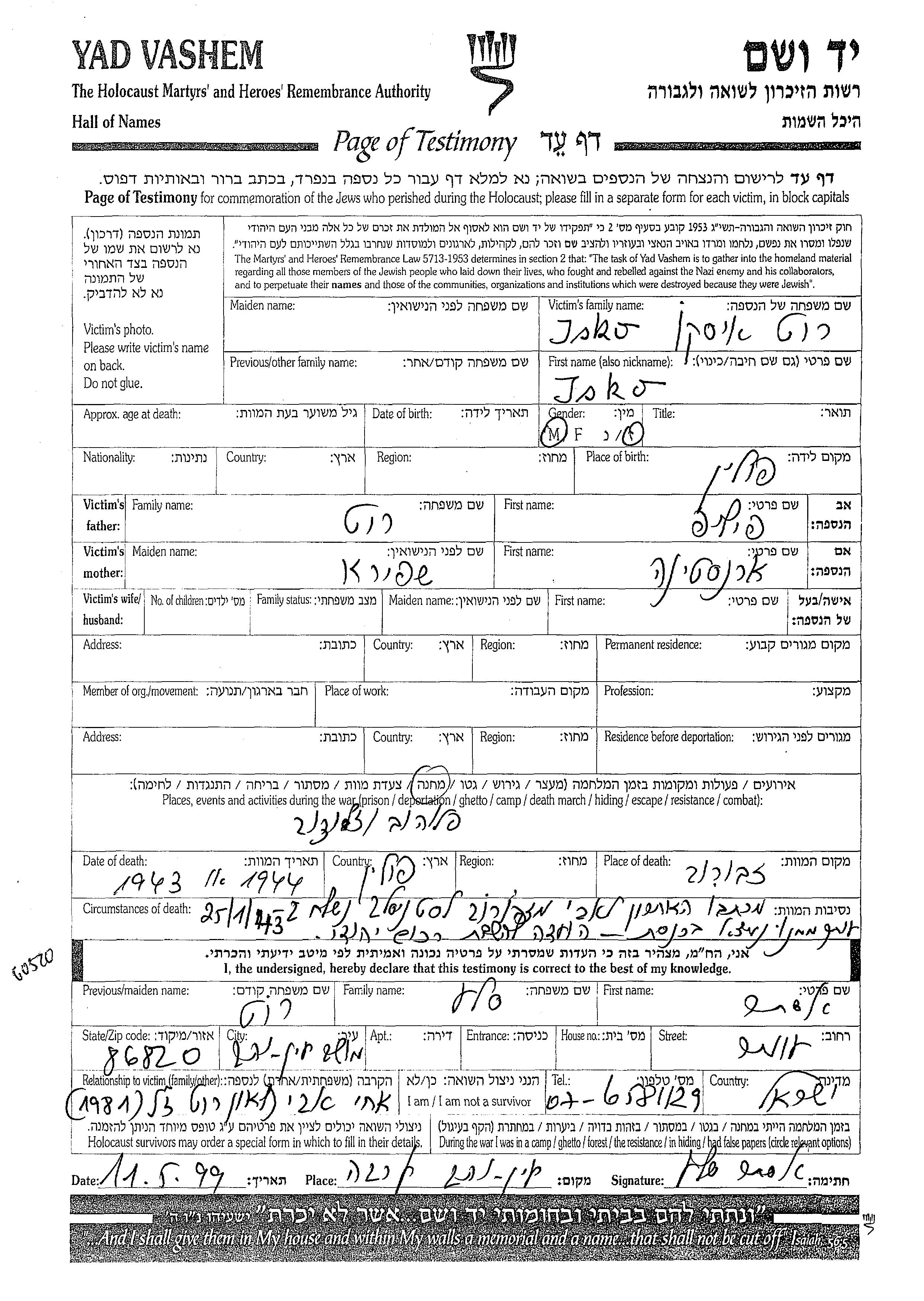 Яд Вашем - Листы свидетельских показаний Мемориального фонда
