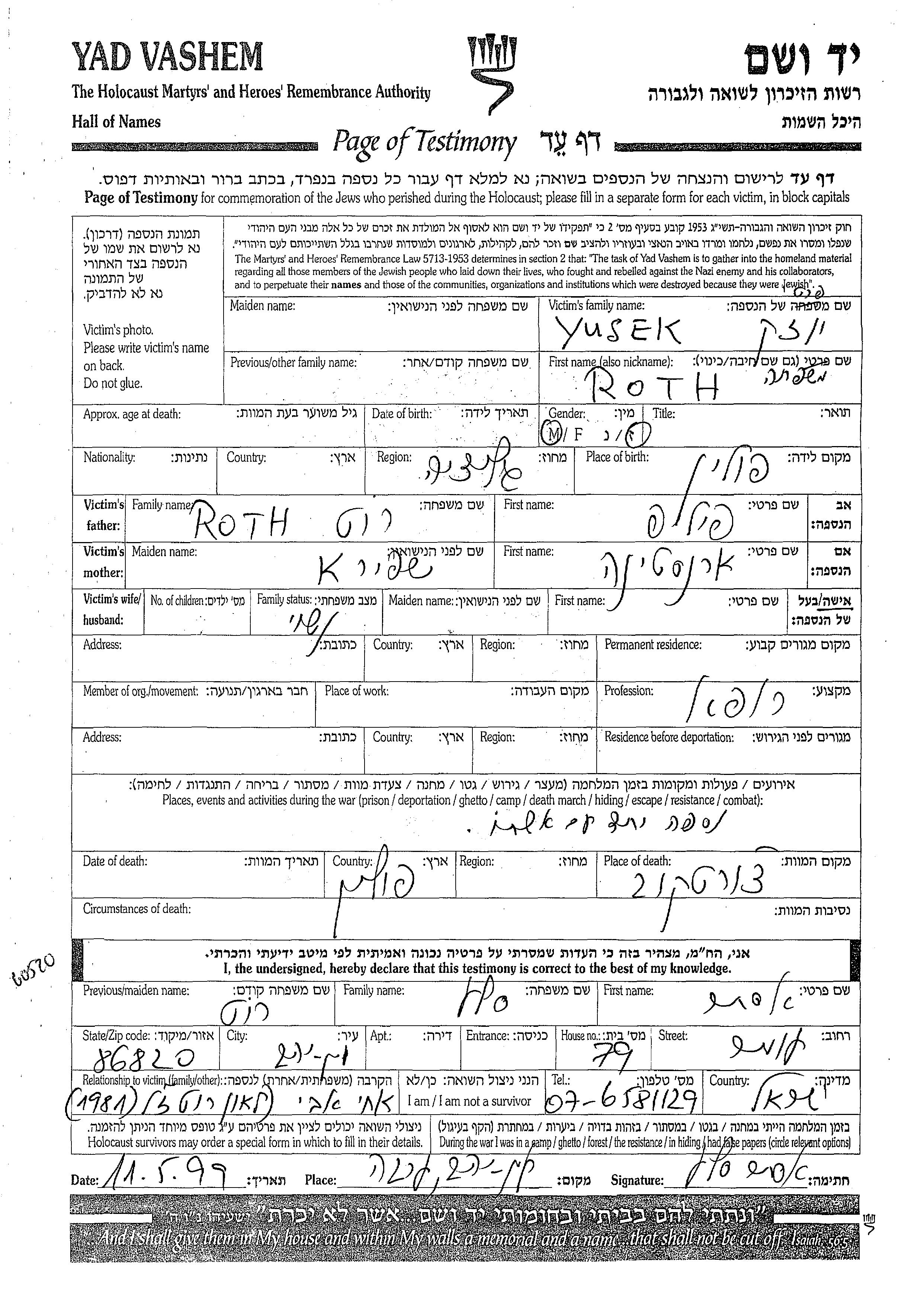 Рот Иосеф место не указано, Лист свидетельских показаний