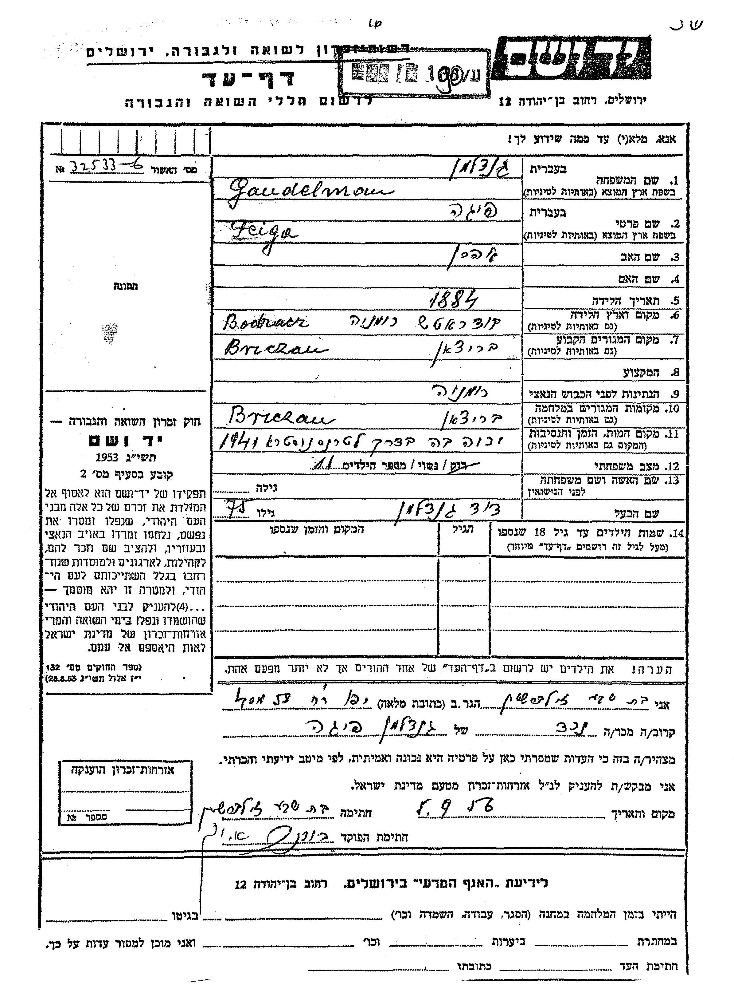 Фейга Гандельман, место рождения: Бэдичень, Румыния. Отец: Аарон. Женат / замужем. Место жительства до войны: Бричан, Румыния. Место во время войны: Бричан, Румыния.