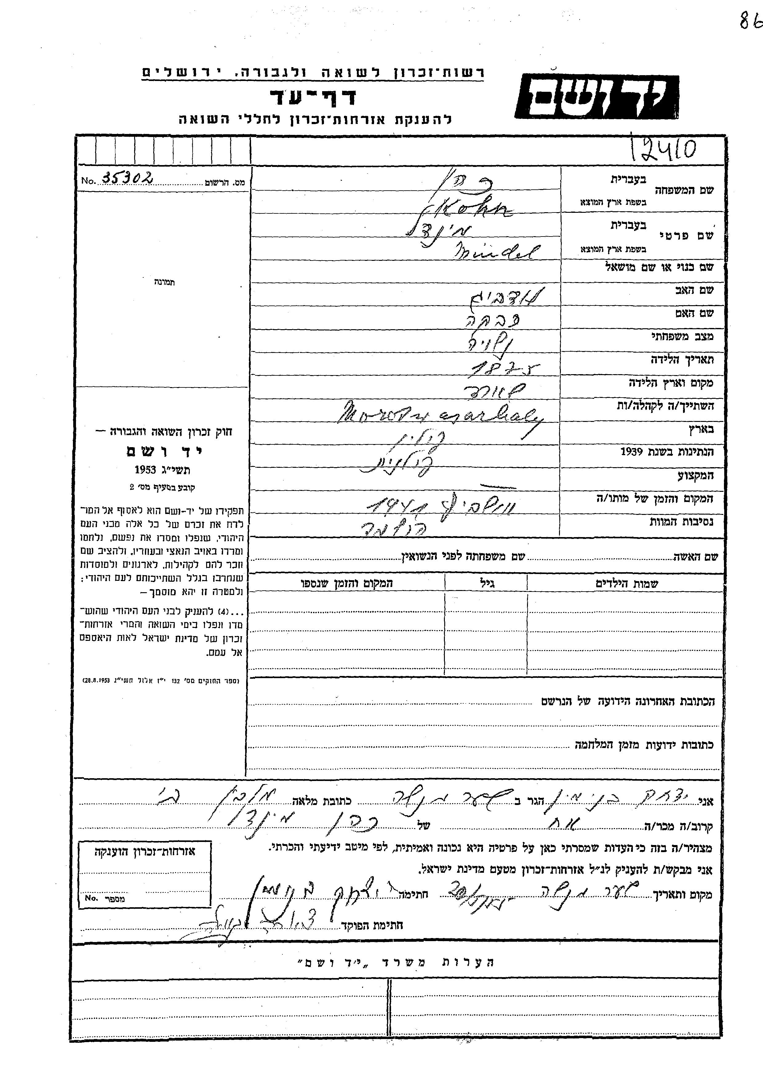 Миндель Кон, место рождения: Шард, Чехословакия. Отец: Лудвиг, mать:Ривка. Женат / замужем.