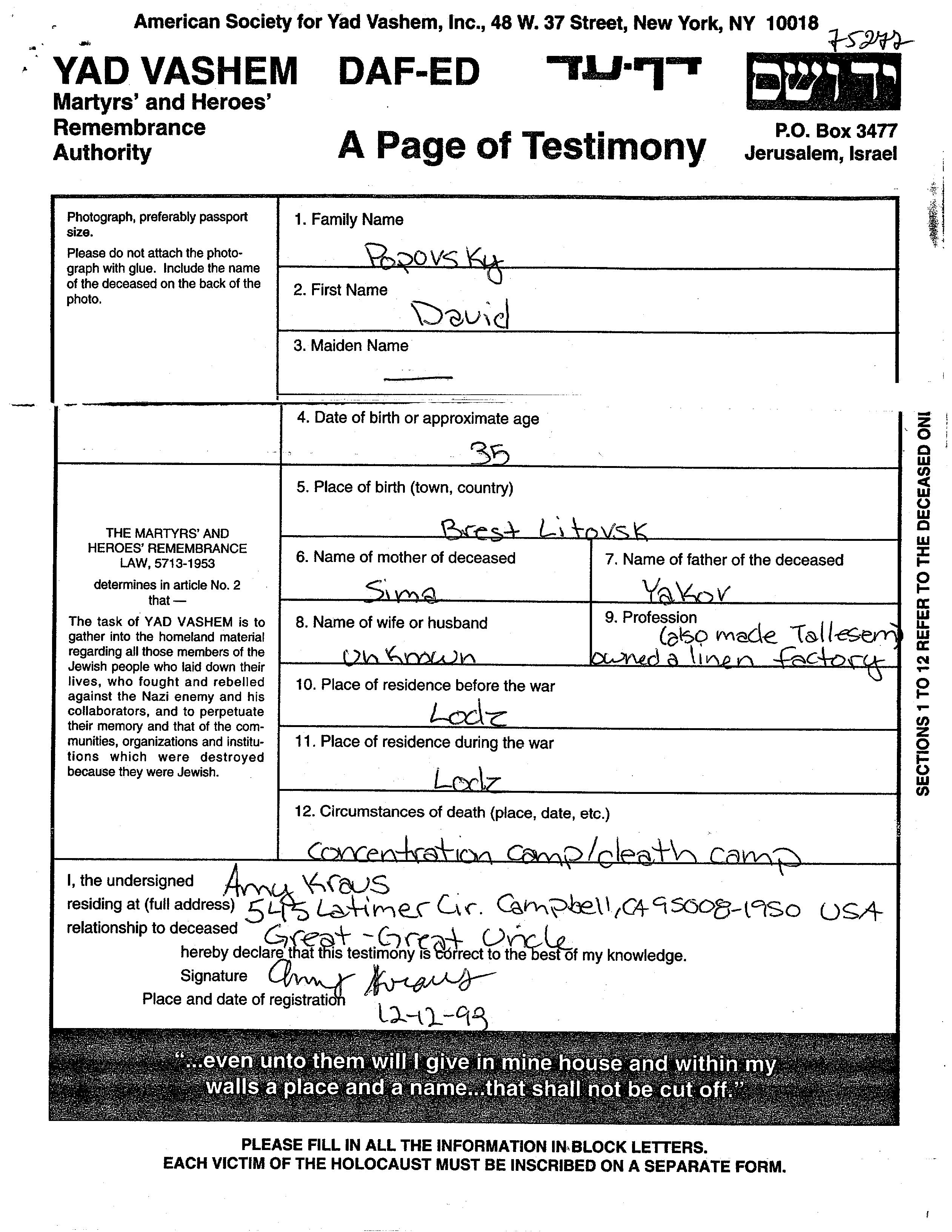 Давид Поповски, место рождения: Брест-Литовск, Польша. Отец: Яков, mать:Сима. Linen factory owner. Место жительства до войны: Лодзь, Польша. Место во время войны: Лодзь, Польша.