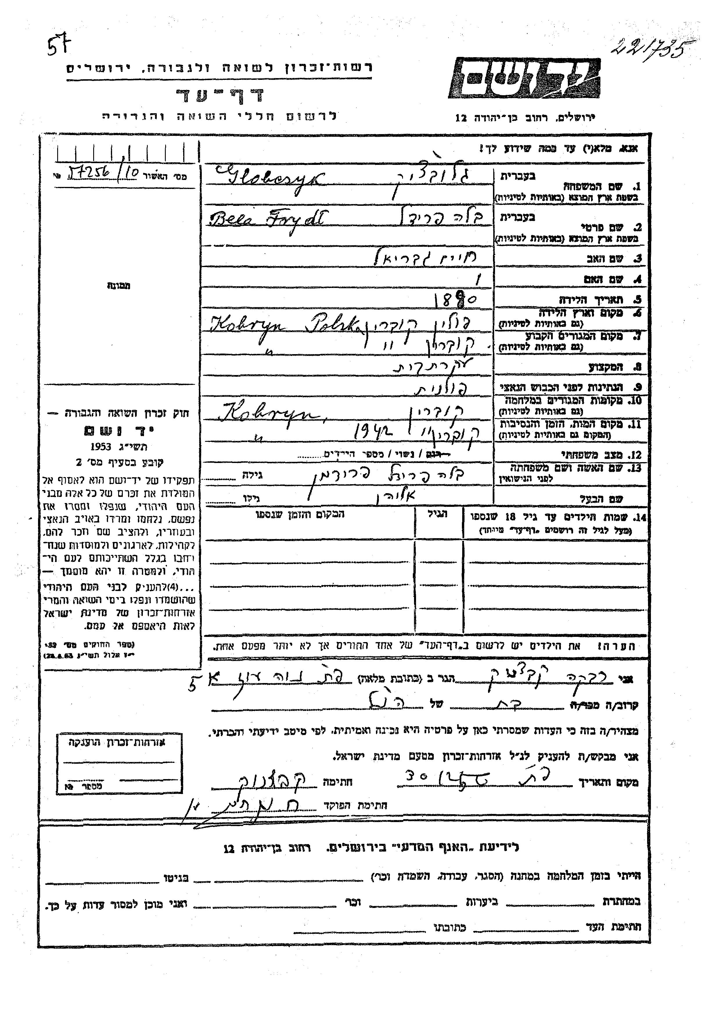 Фридль Бела Глобчик, девичья фамилия Фридман, место рождения: Кобрынь, Польша. Отец: Хаим Габриэль. Домохозяйка. Женат / замужем. Место жительства до войны: Кобрынь, Польша. Место во время войны: Кобрынь, Польша.