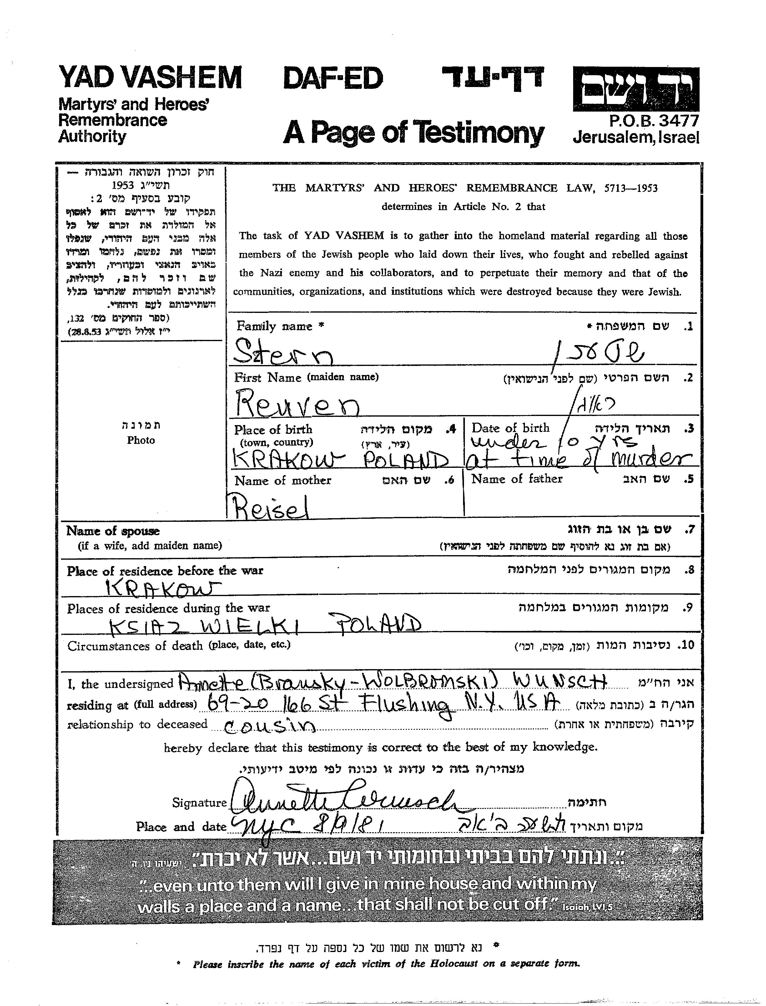 Штерн Реувен Краков, Польша Лист свидетельских показаний