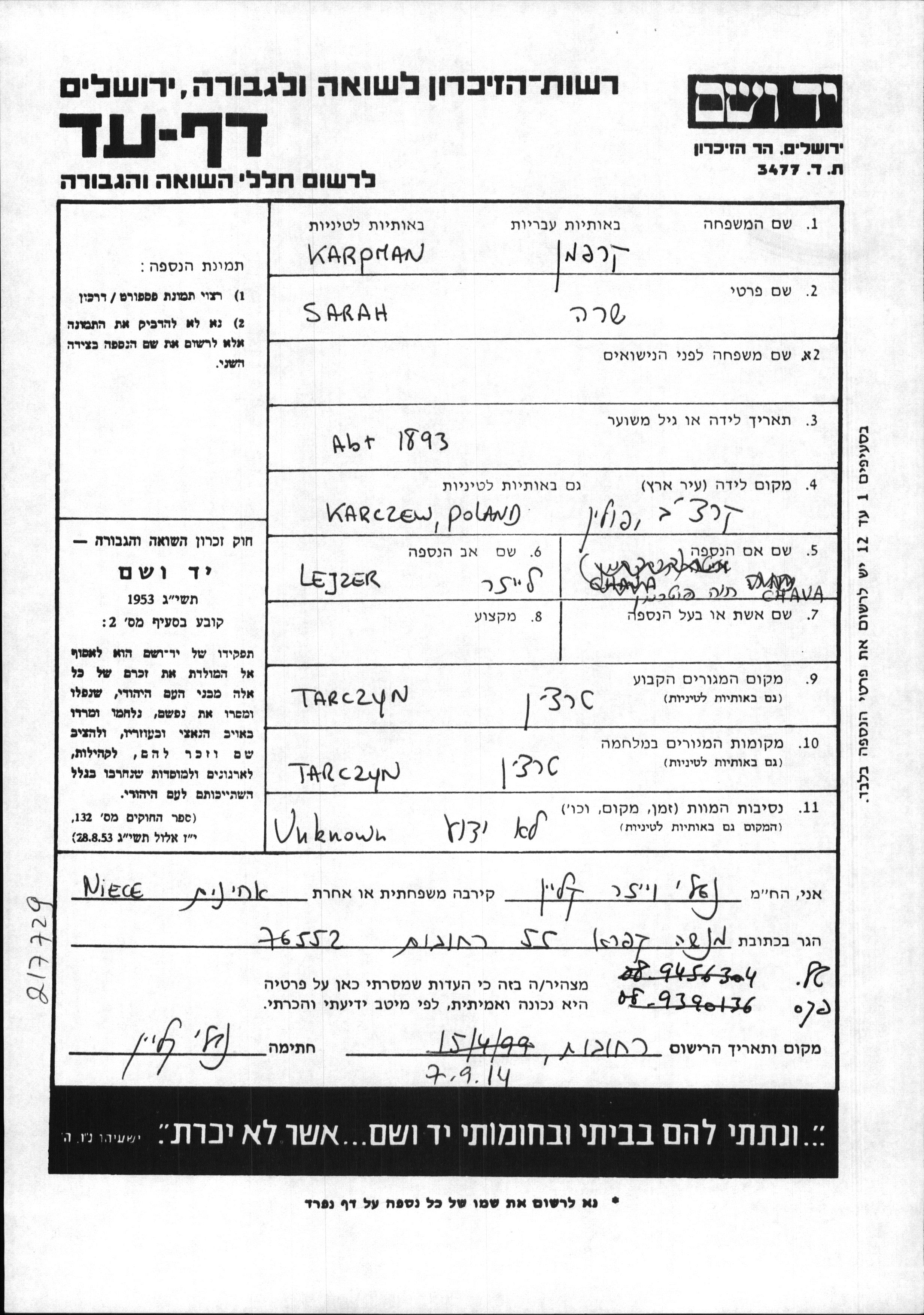 Сара Карпман, место рождения: Карчев, Польша. Отец: Лейзер, mать:Хава, девичья фамилия Потерман. Место жительства до войны: Тарчин, Польша. Место во время войны: Тарчин, Польша.
