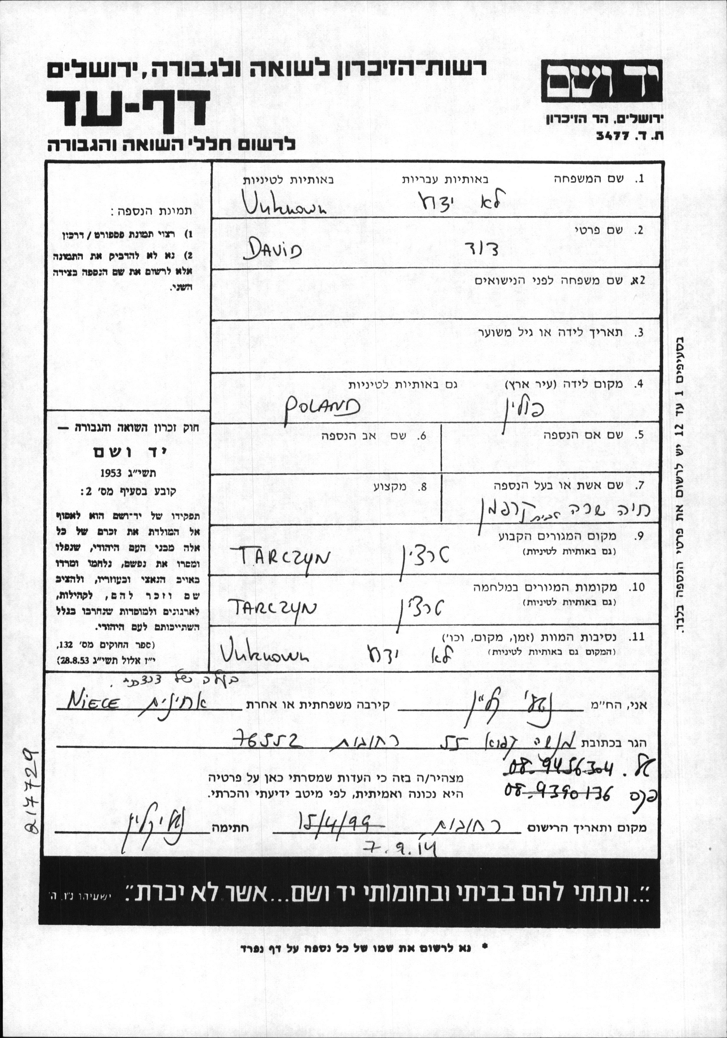 Давид Фамилия неизвестна, место рождения: Польша. Женат / замужем. Место жительства до войны: Тарчин, Польша. Место во время войны: Тарчин, Польша.