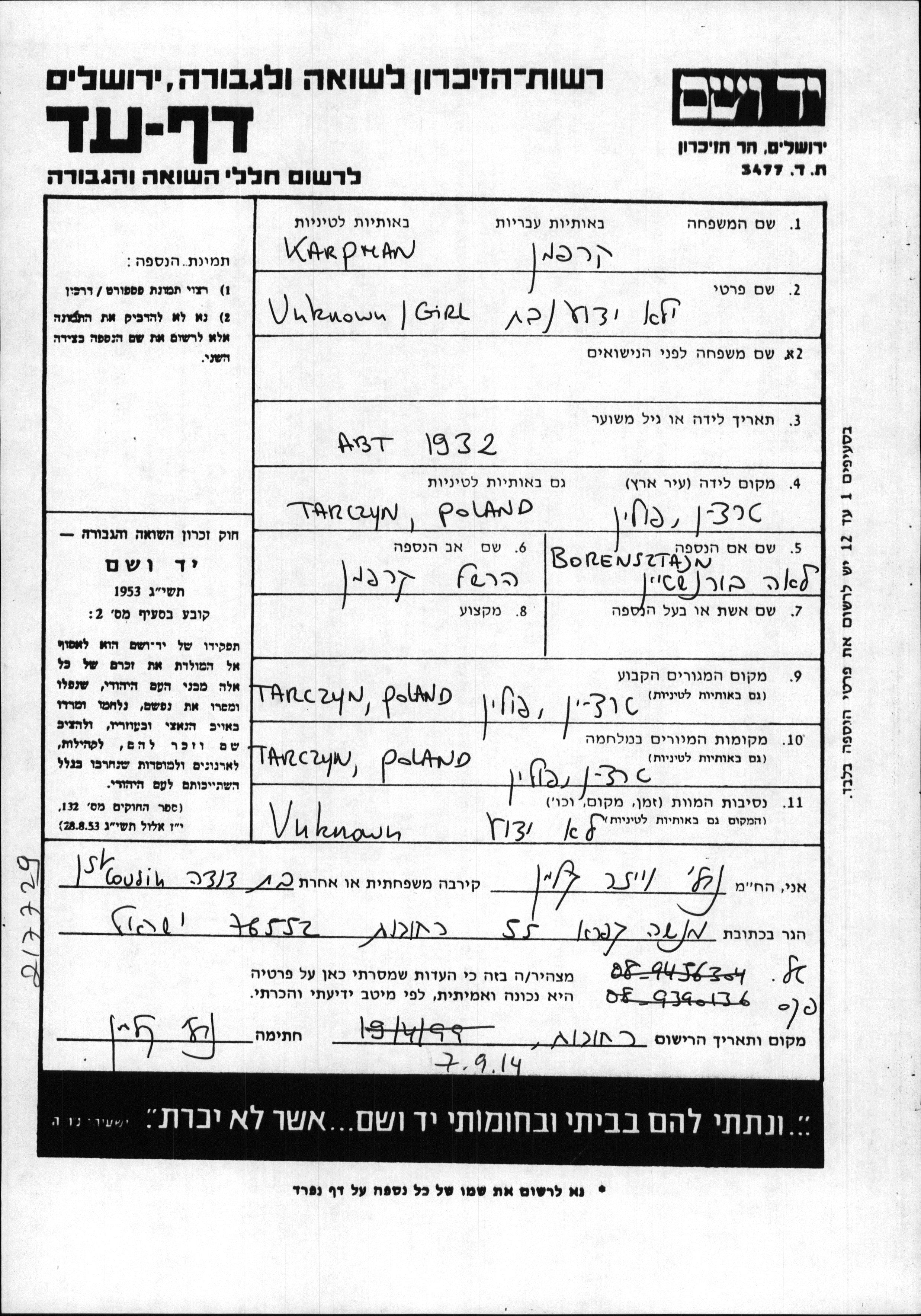 Имя неизвестно Карпман, место рождения: Тарчин, Польша. Отец: Гершель, mать:Лея, девичья фамилия Боренштайн. Ребенок. Место жительства до войны: Тарчин, Польша. Место во время войны: Тарчин, Польша.