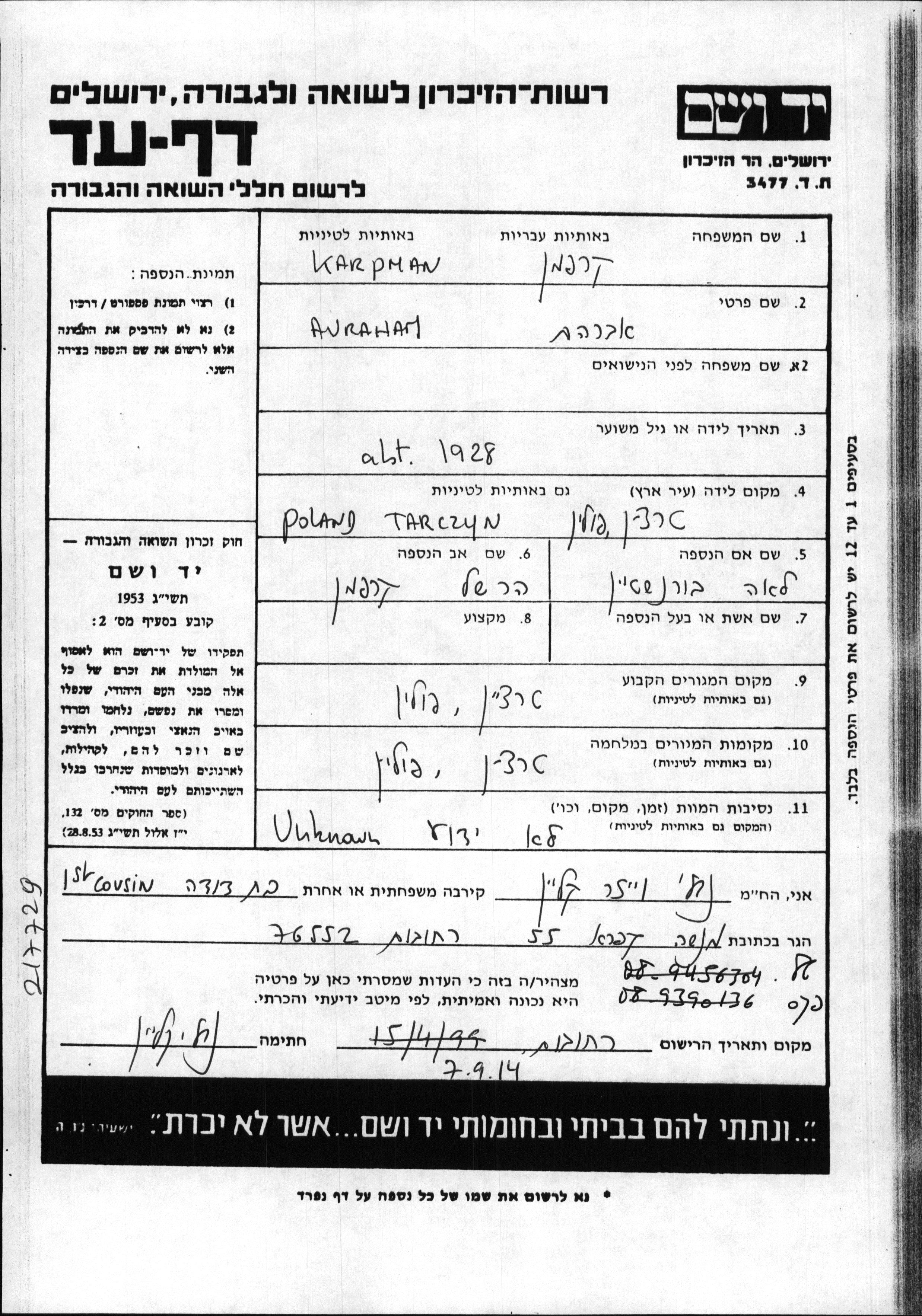 Карпман Авраам 1928 Тарчин, Польша Лист свидетельских показаний