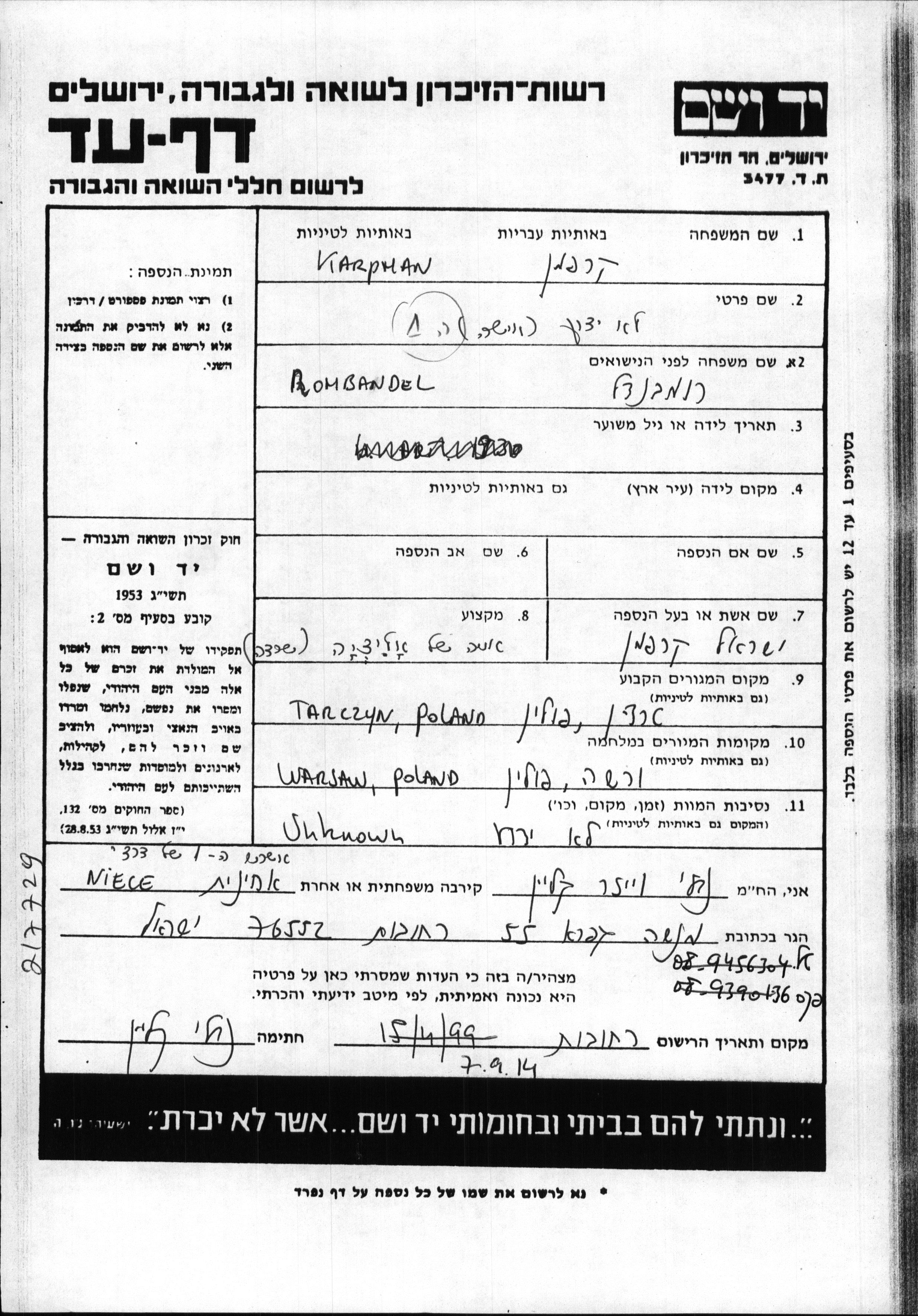 Имя неизвестно Карпман, девичья фамилия Ромбандель. Женат / замужем. Место жительства до войны: Тарчин, Польша. Место во время войны: Варшава, Польша.