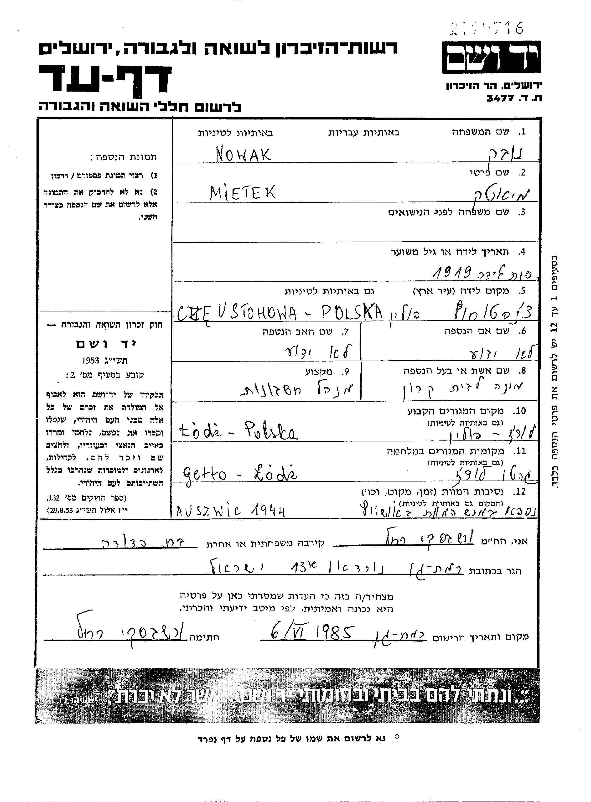 Метек Новак, место рождения: Ченстохова, Польша. Бухгалтер / счетовод. Женат / замужем. Место жительства до войны: Лодзь, Польша. Место во время войны: Лодзь, Польша.