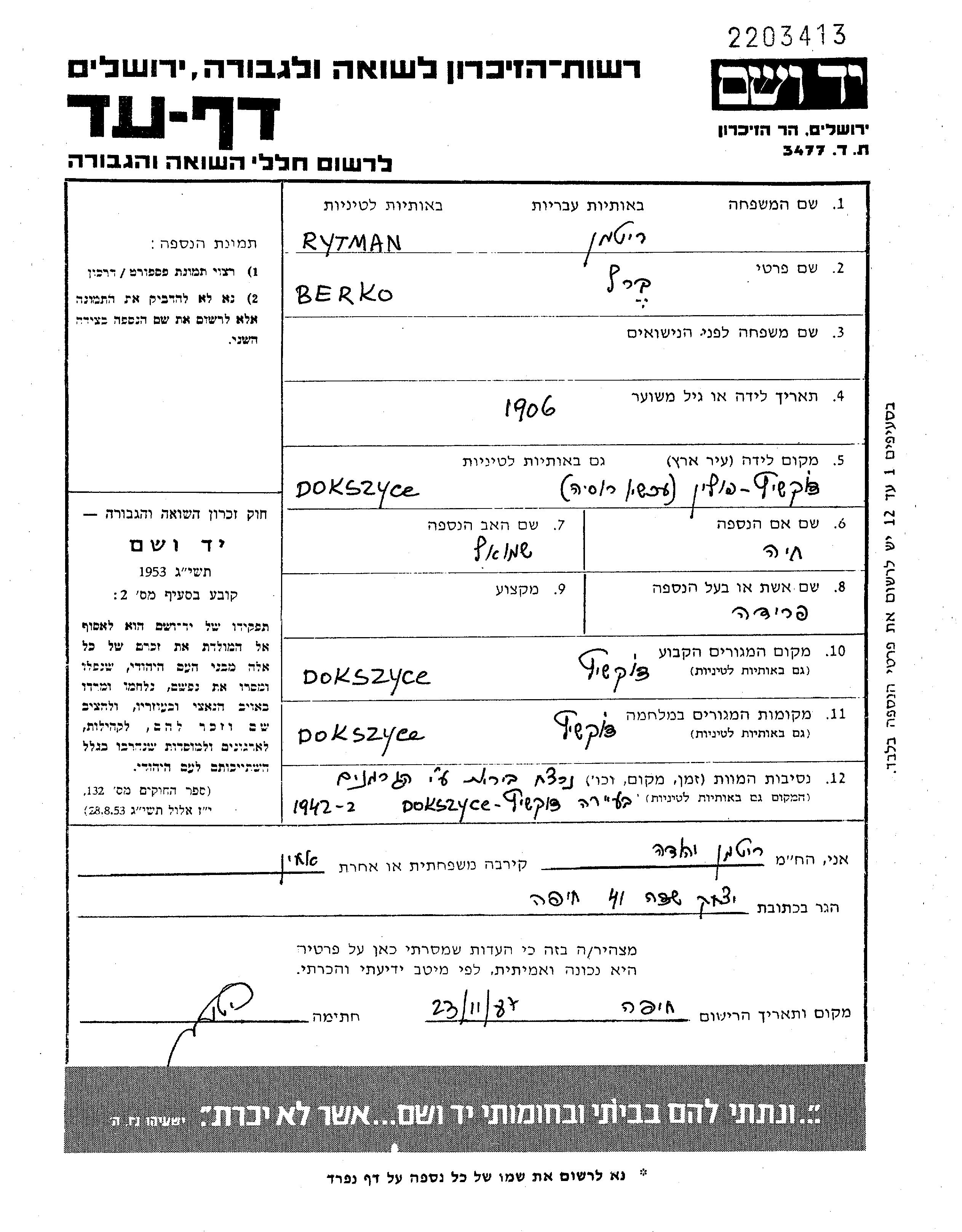 Берл Дов Рытман, место рождения: Докшицы, Польша. Отец: Шмуэль, mать:Хая. Женат / замужем. Место жительства до войны: Докшицы, Польша. Место во время войны: Докшицы, Польша.