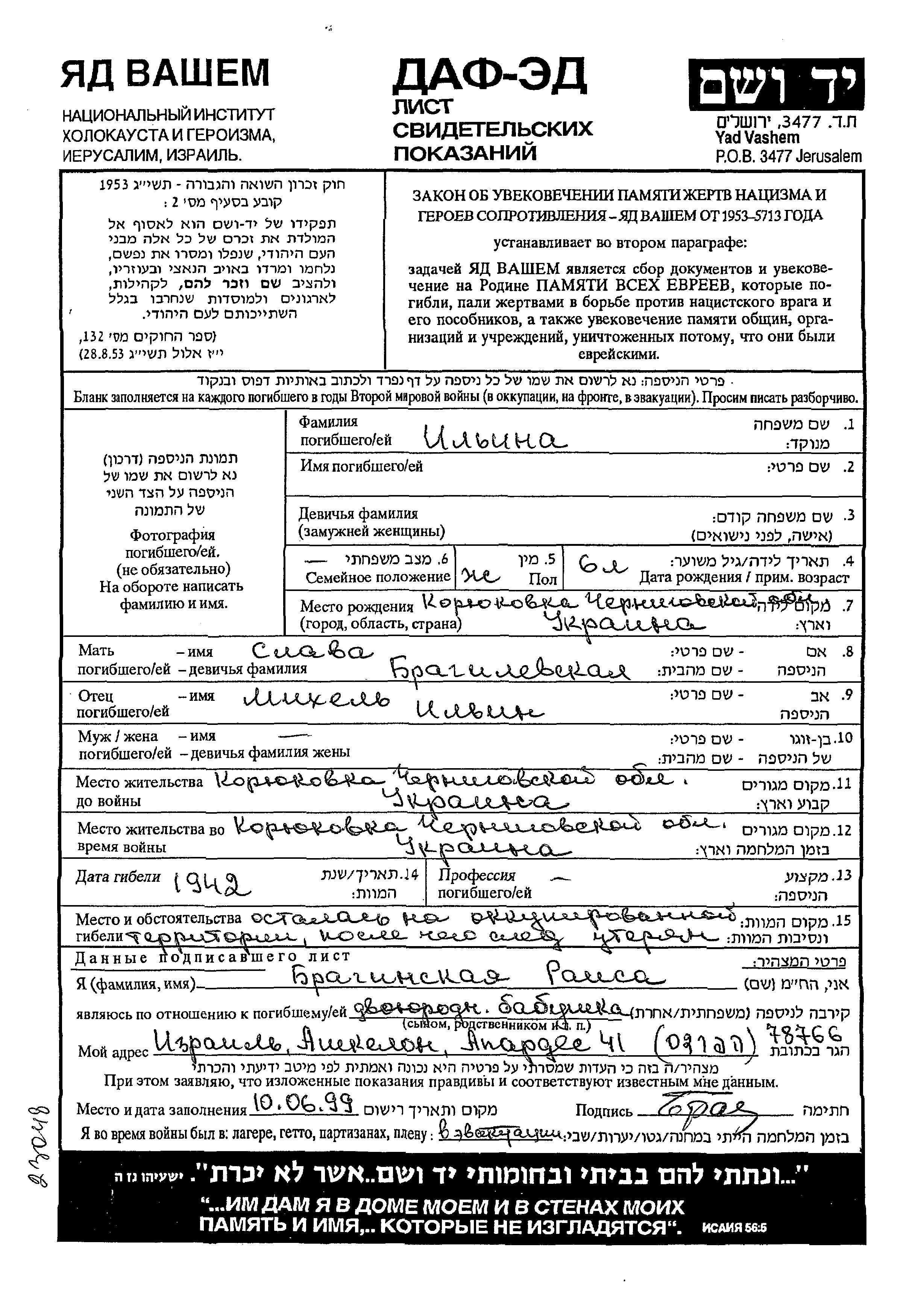 Илин Имя неизвестно Корюковка, Украина (СССР) Лист свидетельских показаний