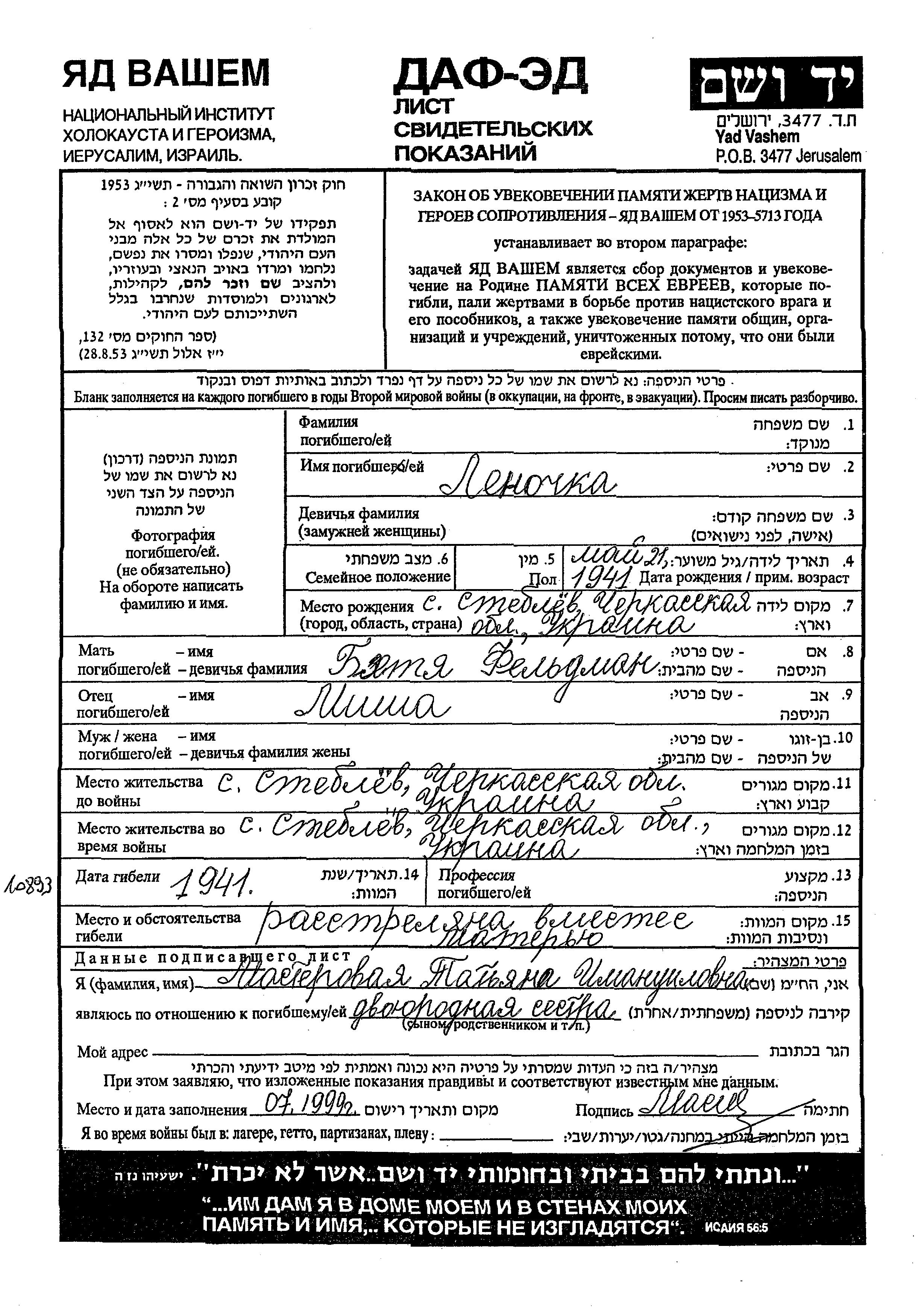 Яд Вашем - Листы свидетельских показаний Мемориального фонда