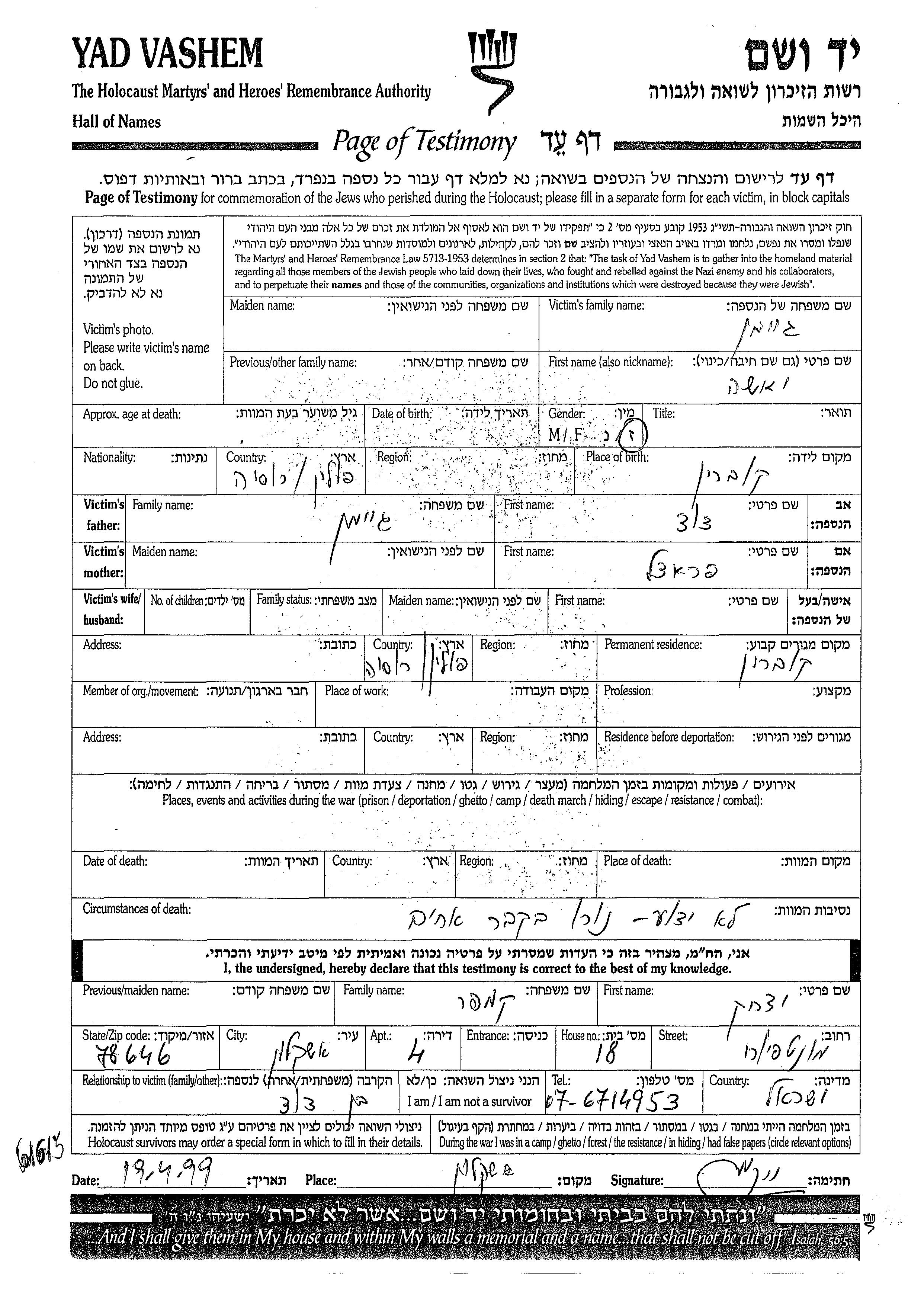 Яд Вашем - Листы свидетельских показаний Мемориального фонда
