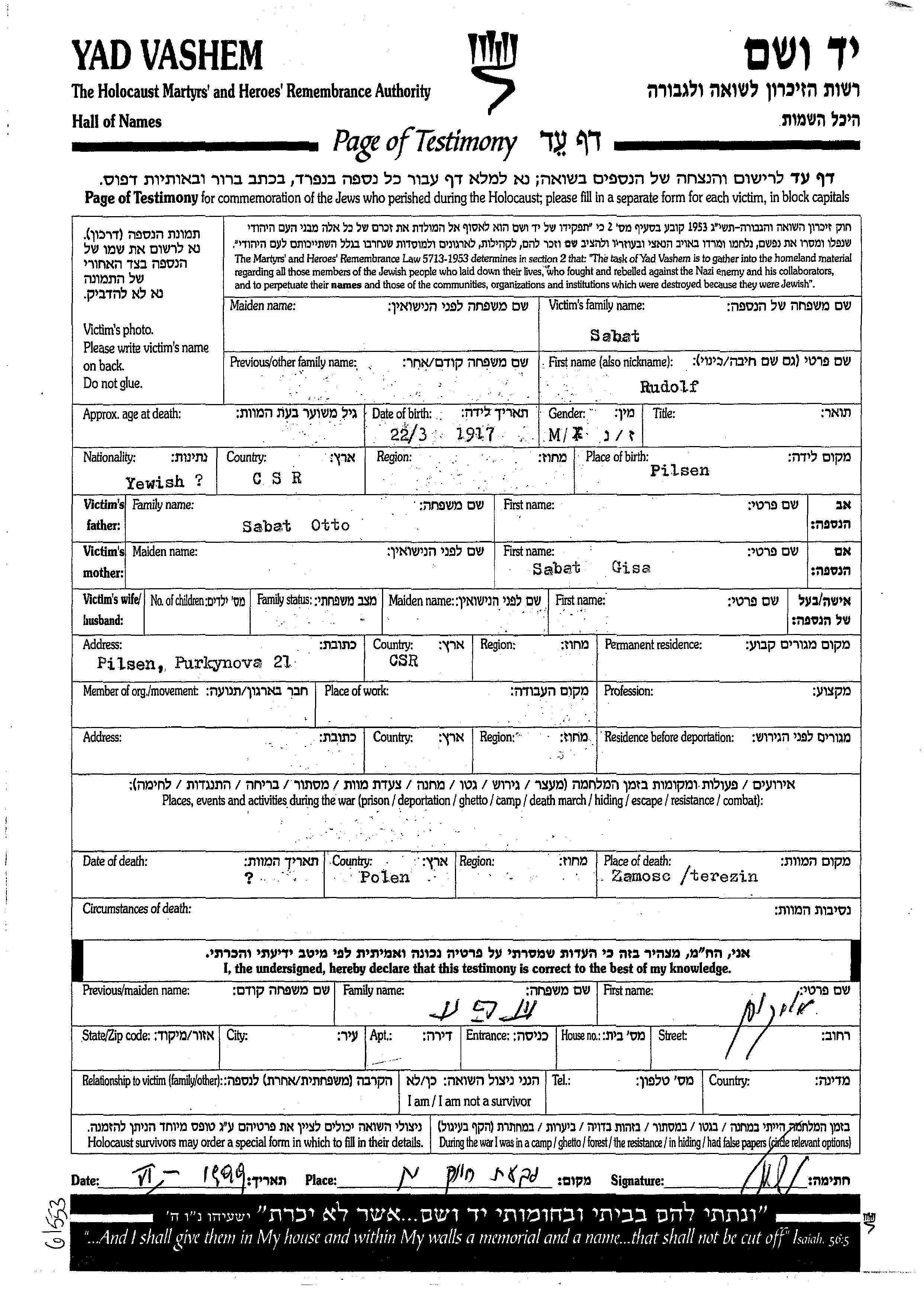 Рудольф Сабат, место рождения: Пильшен, Чехословакия.Mать:Гиса. Место жительства до войны: Пильшен, Чехословакия.