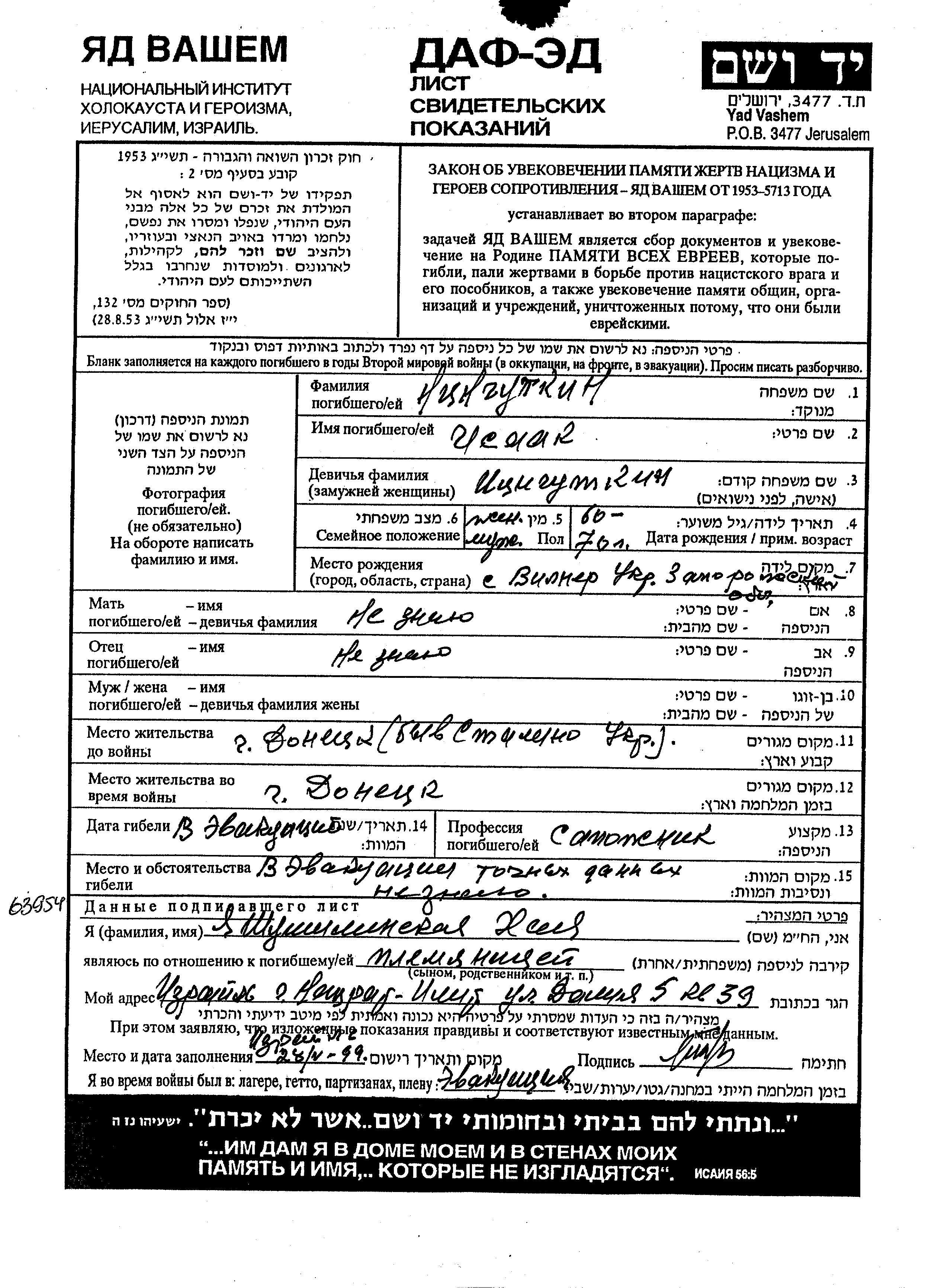 Ицигуткин Исаак Донецк, Украина (СССР) Лист свидетельских показаний
