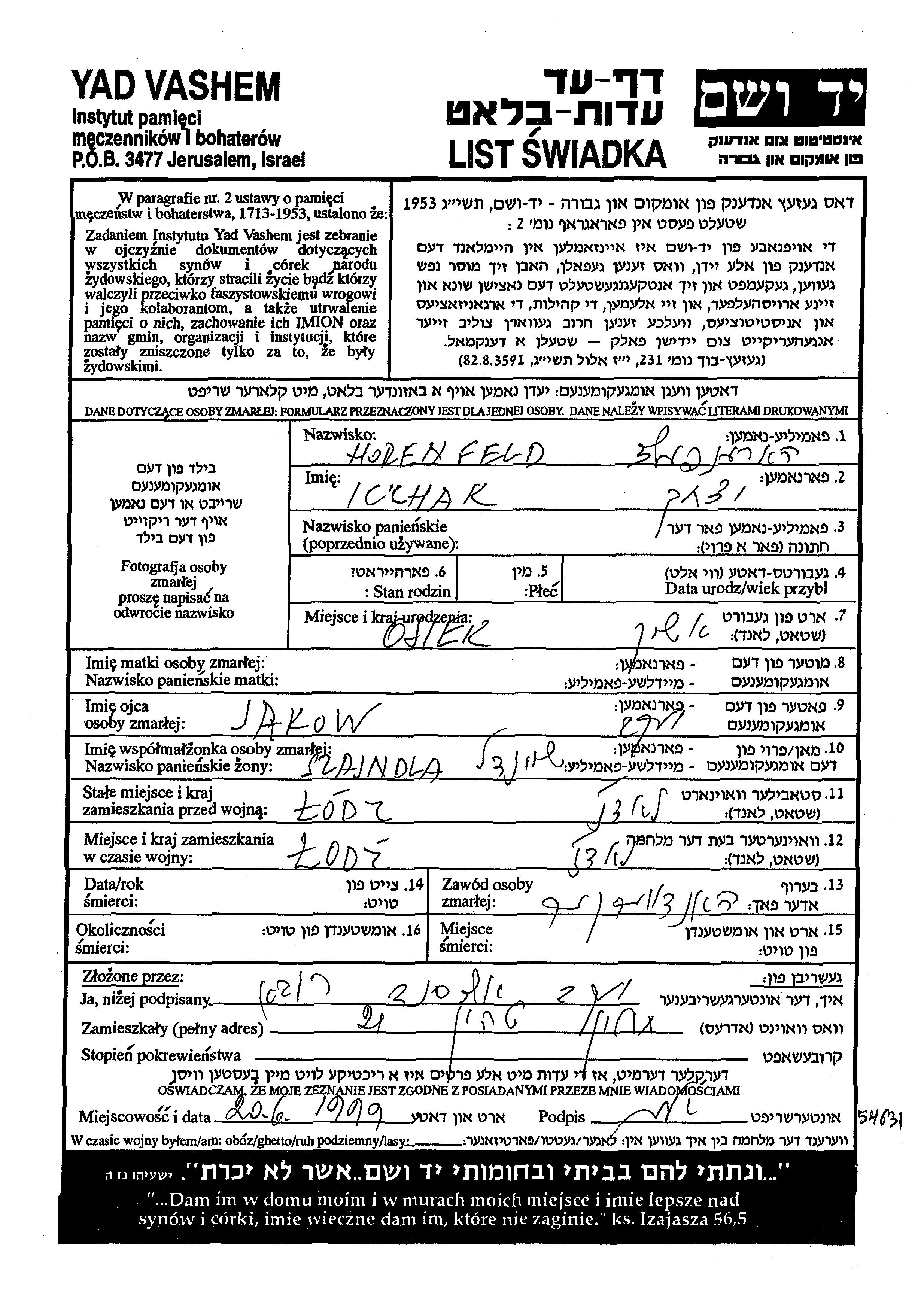 Хоренфельд Ицхак Лодзь, Польша Лист свидетельских показаний