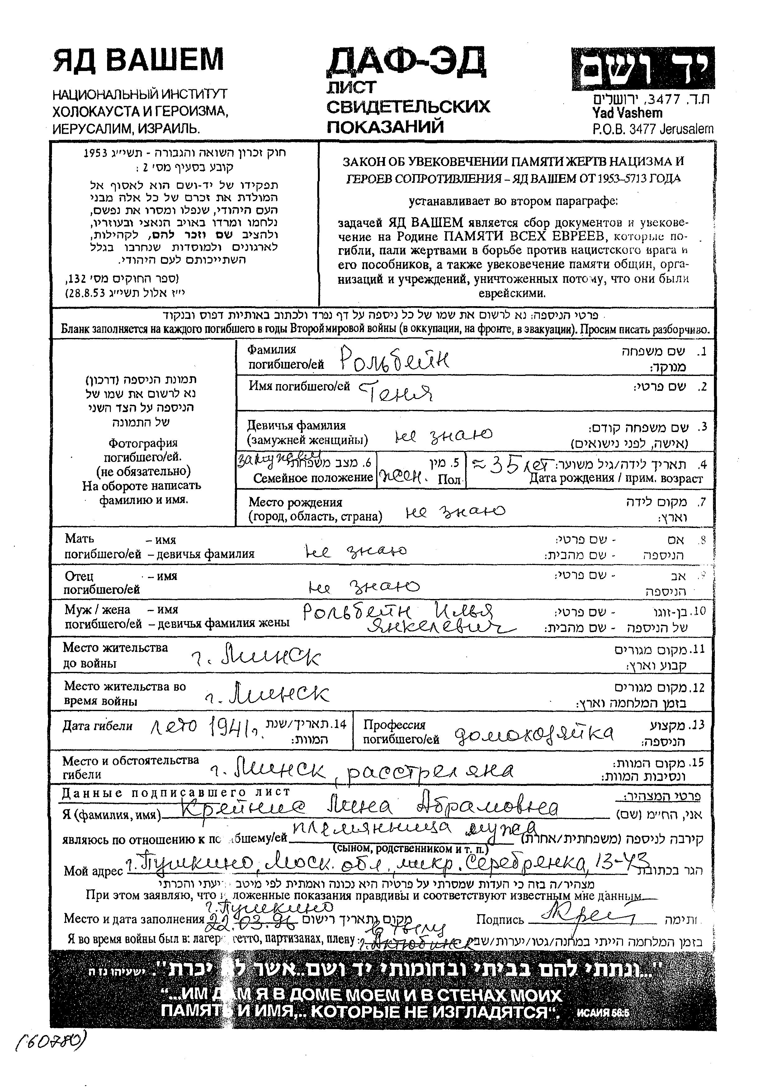 Яд Вашем - Листы свидетельских показаний Мемориального фонда