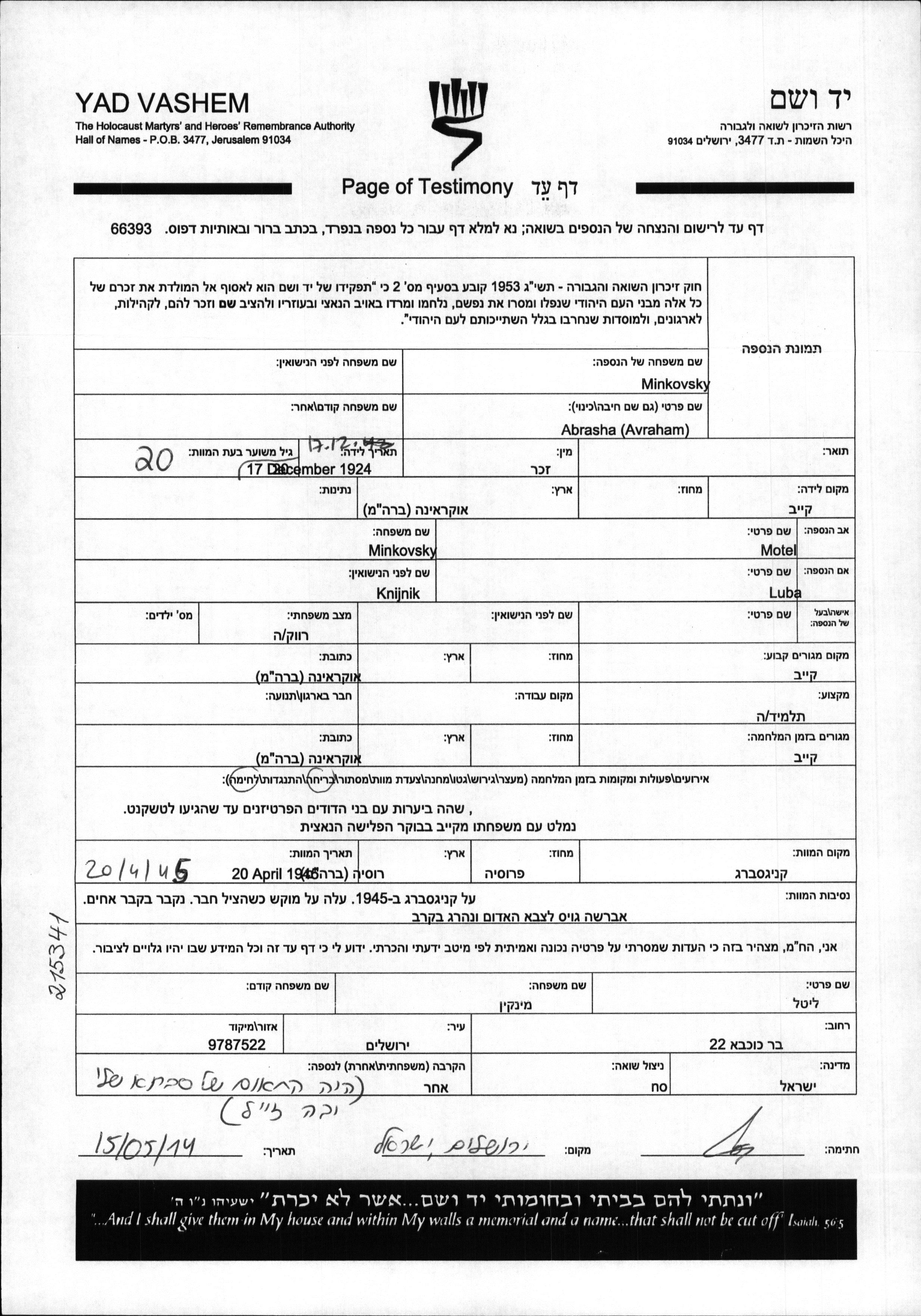 Абраша Минковски, место рождения: Киев, Украина (СССР). Отец: Мотел, mать:Люба, девичья фамилия Knijnik. Ученик / ученица. Холост / не замужем. Место жительства до войны: Киев, Украина (СССР). Место во время войны: Вооруженные силы Советского Союза. Абраша погиб на военной службе. место смерти: Кенигсберг, Германия в 20/04/1945.