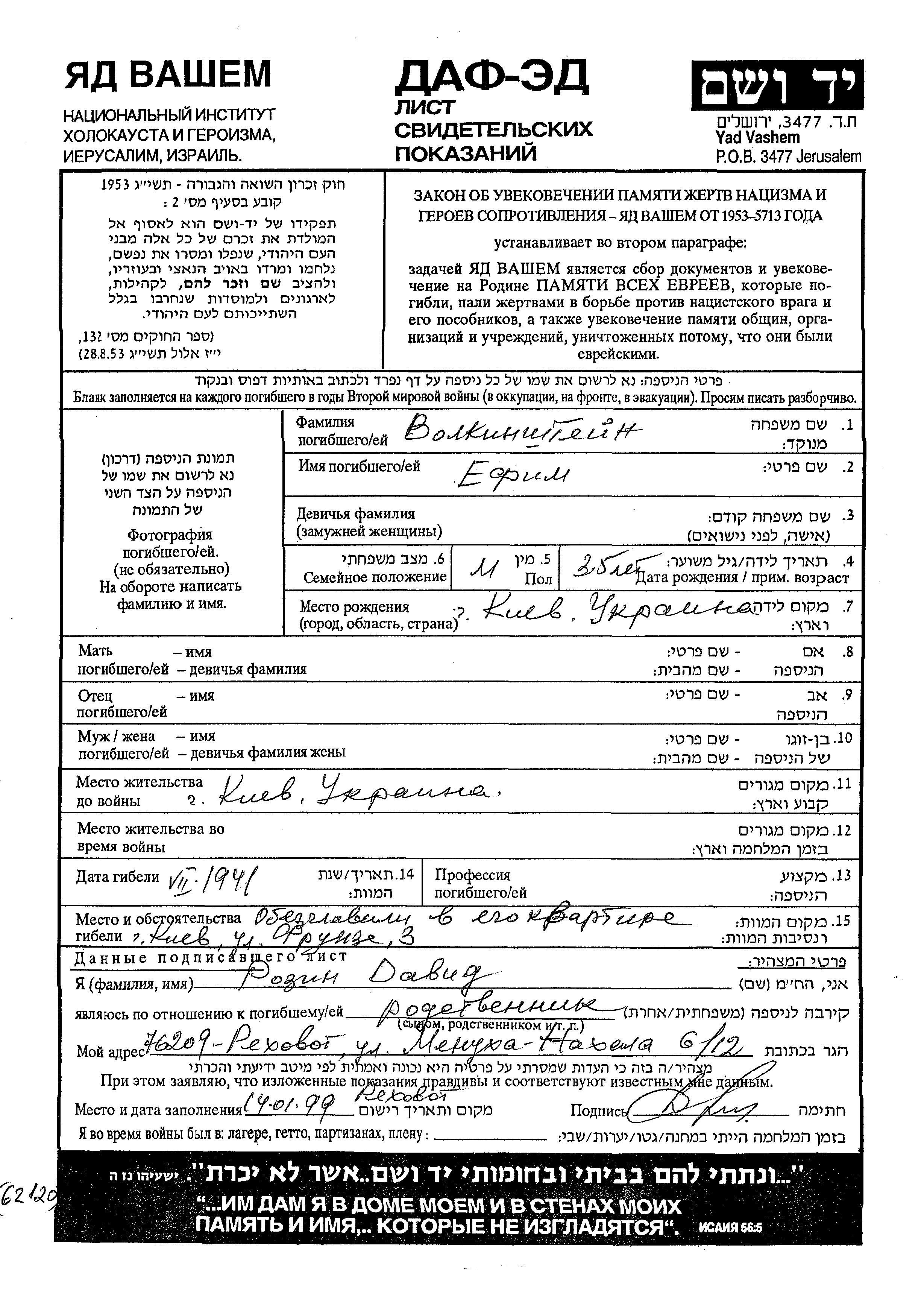 Волкинштейн Ефим Киев, Украина (СССР) Лист свидетельских показаний