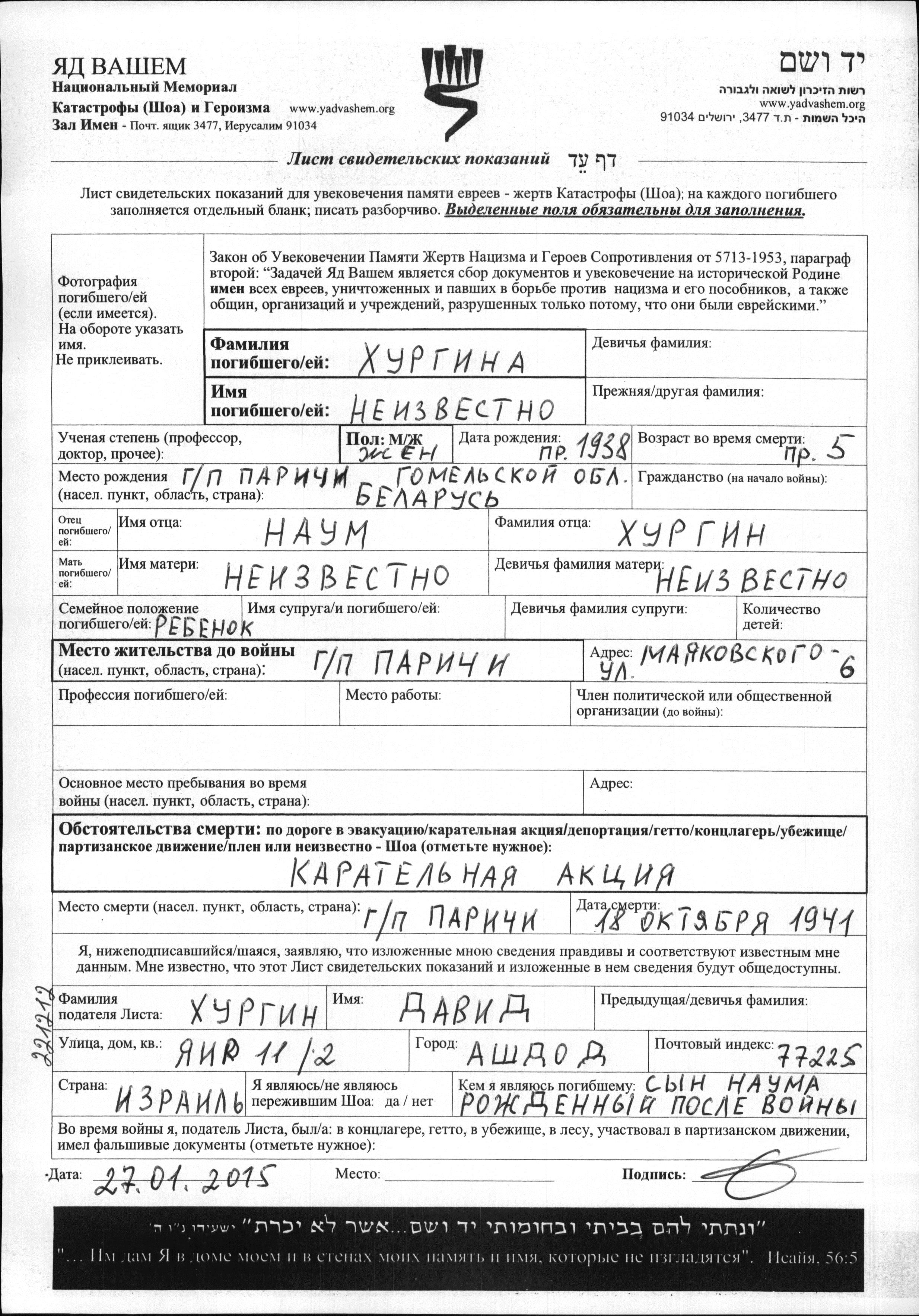 Хургина Имя неизвестно 1938 Паричи, Белоруссия (СССР) Лист свидетельских показаний