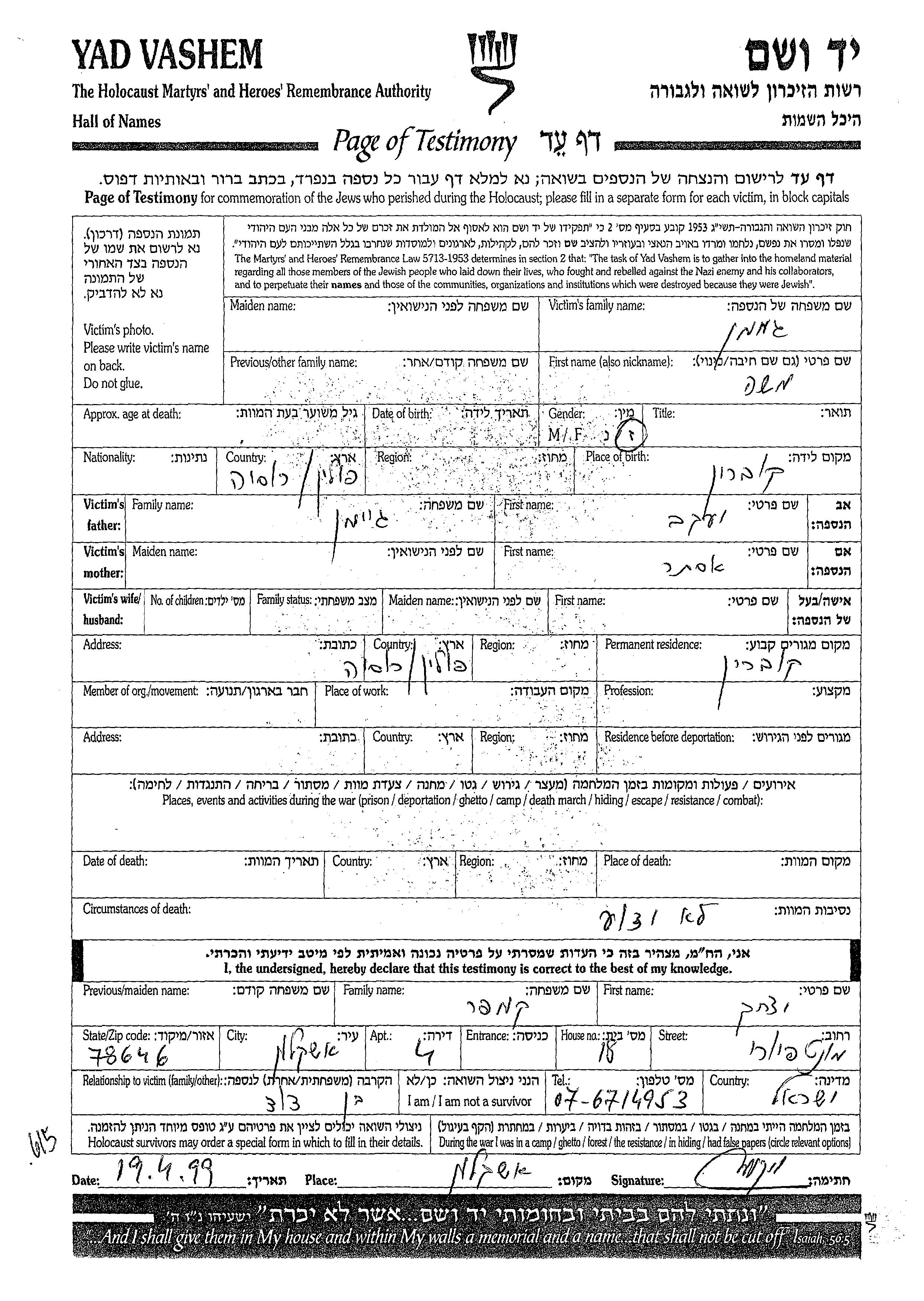 Яд Вашем - Листы свидетельских показаний Мемориального фонда