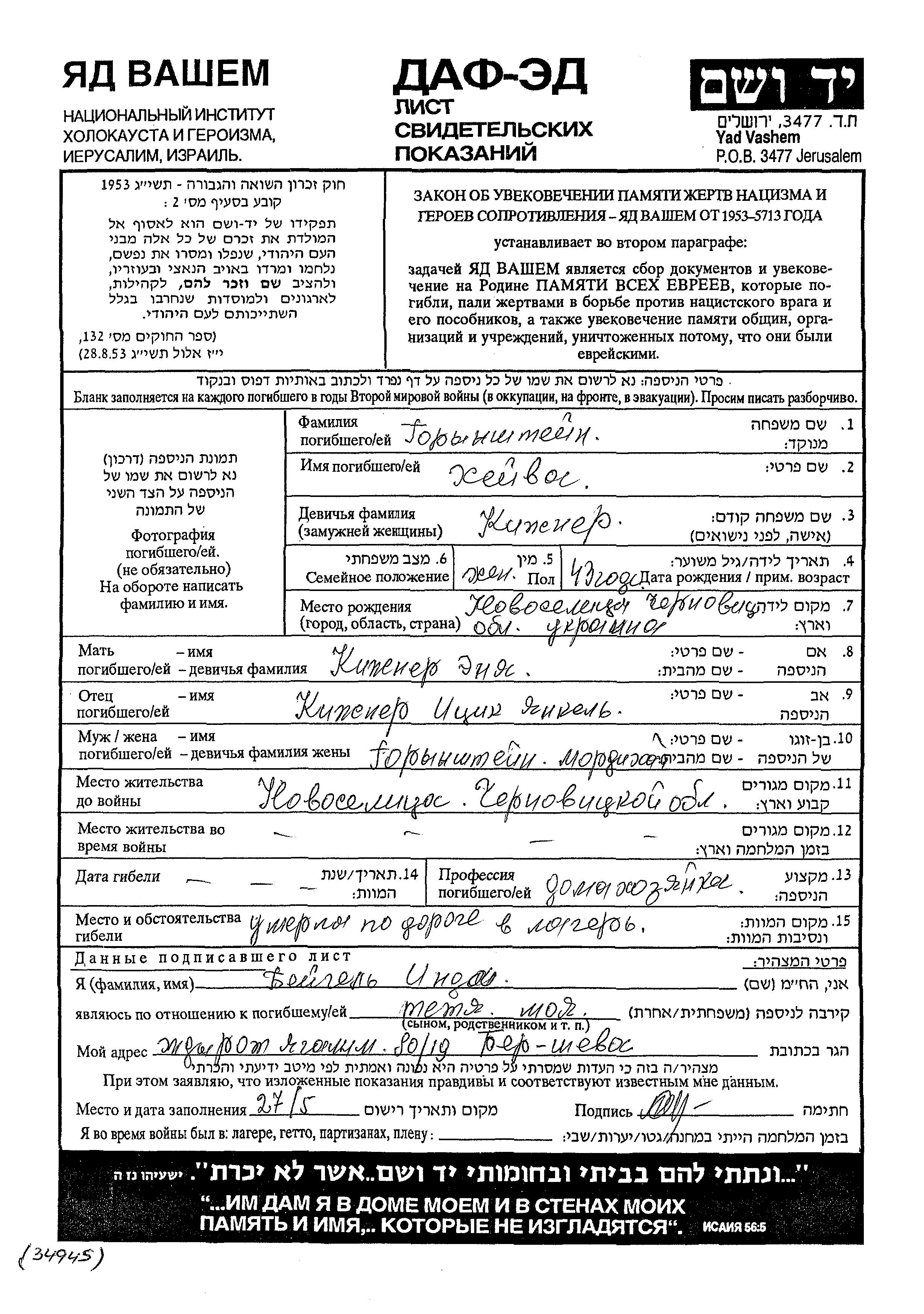 Хейва Горинштейн, девичья фамилия Кижнер, место рождения: Новоселица, Румыния. Отец: Ицик Янкель, mать:Эня. Домохозяйка. Женат / замужем. Место жительства до войны: Новоселица, Румыния.