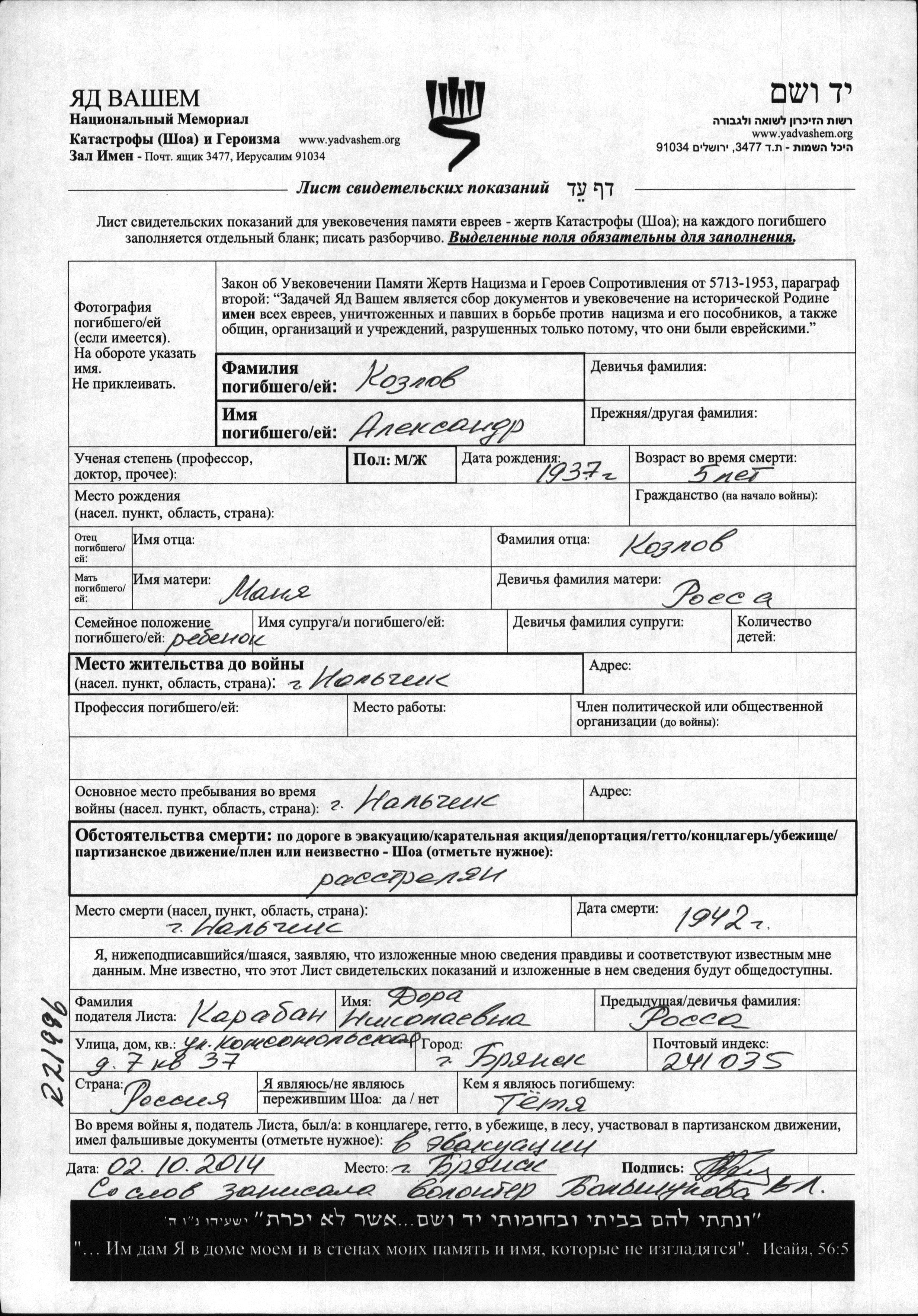 Козлов Александр 1937 Нальчик, Россия (СССР) Лист свидетельских показаний