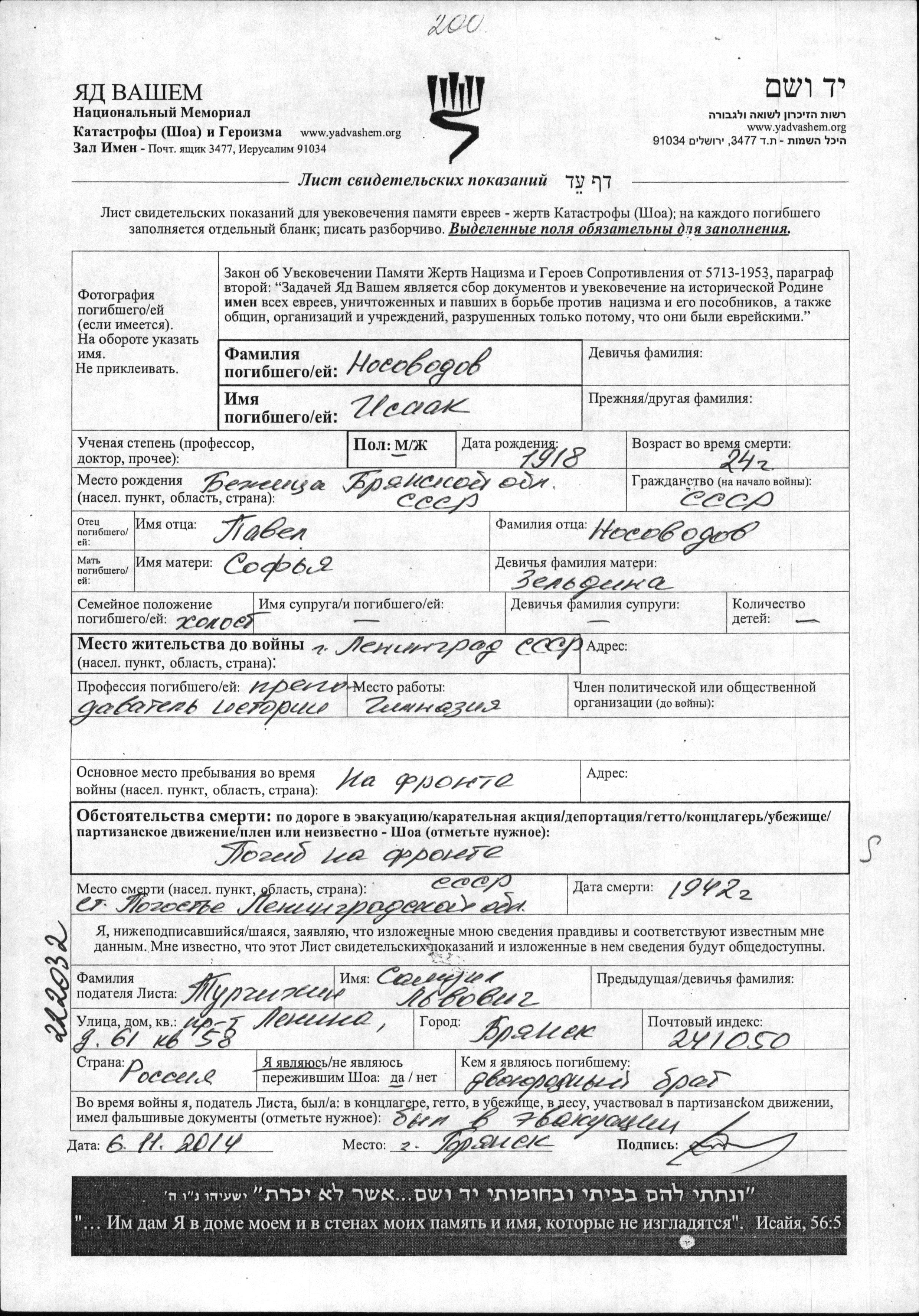 Исаак Носоводов, место рождения: Бежица, Россия (СССР). Отец: Павел, mать:Софья, девичья фамилия Зельдина. Учитель истории. Холост / не замужем. Место жительства до войны: Ленинград, Россия (СССР). Место во время войны: Вооруженные силы Советского Союза. Исаак погиб на военной службе. место смерти: Погостье, Россия (СССР) в 1942.