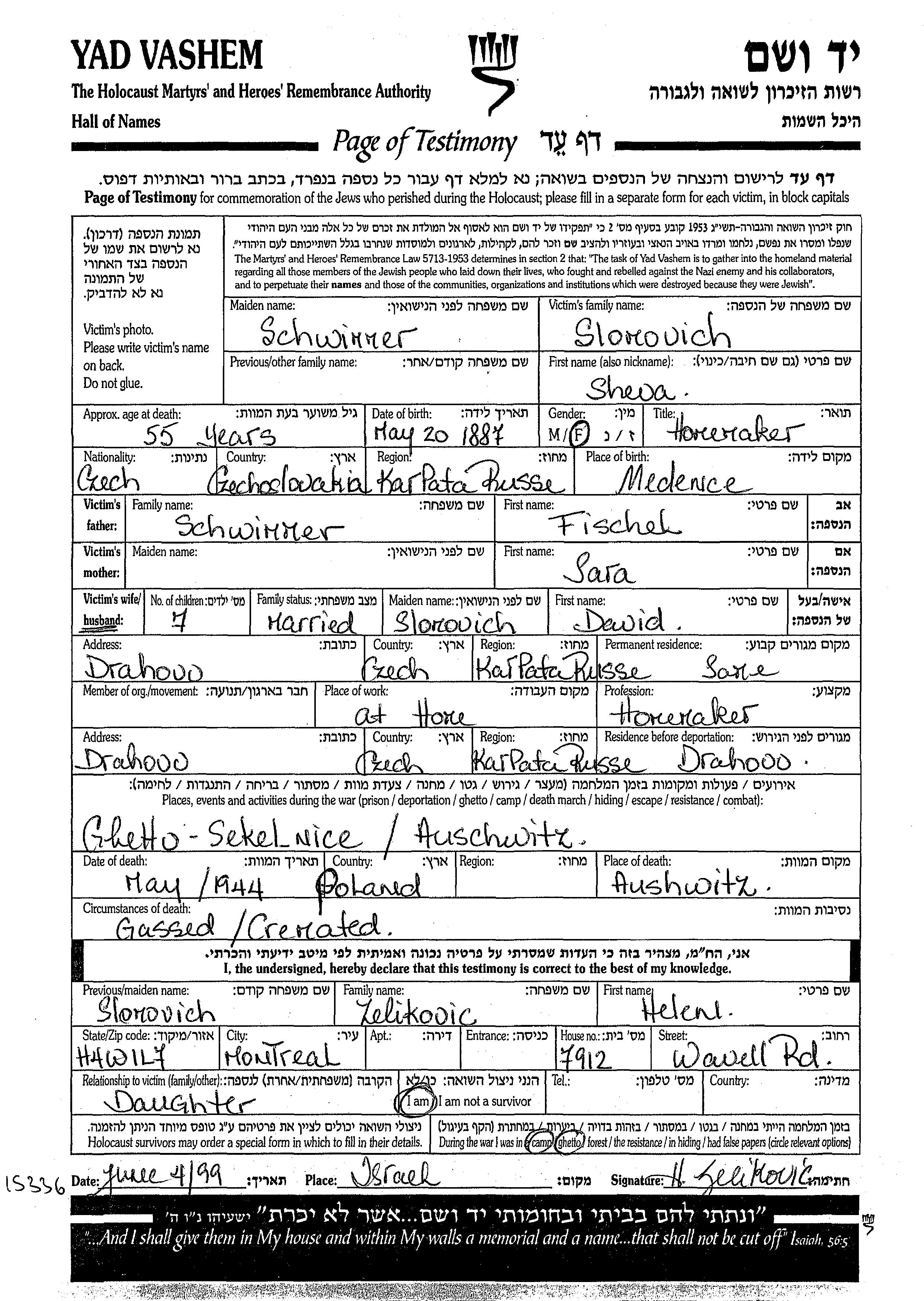 Шева Сломович, девичья фамилия Швиммер, место рождения: Меденица, Польша. Отец: Фишель, mать:Сара. Домохозяйка. Женат / замужем. Место жительства до войны: Драгово, Чехословакия. Место во время войны: Драгово, Чехословакия.