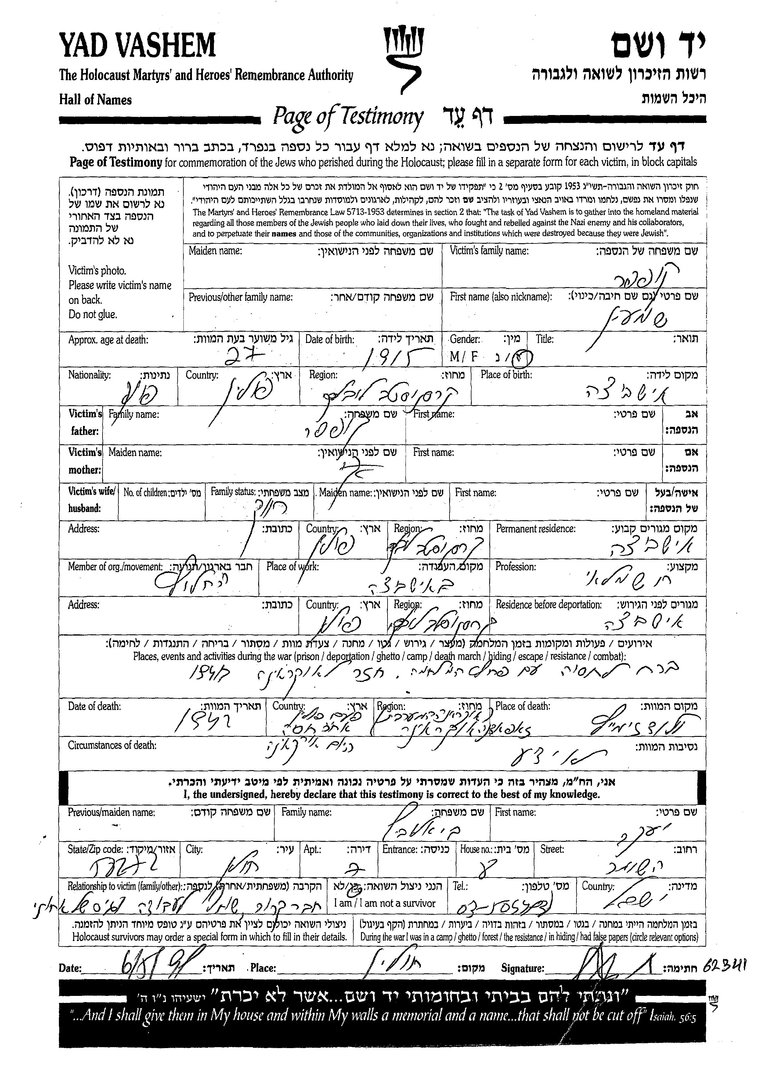 Яд Вашем - Листы свидетельских показаний Мемориального фонда