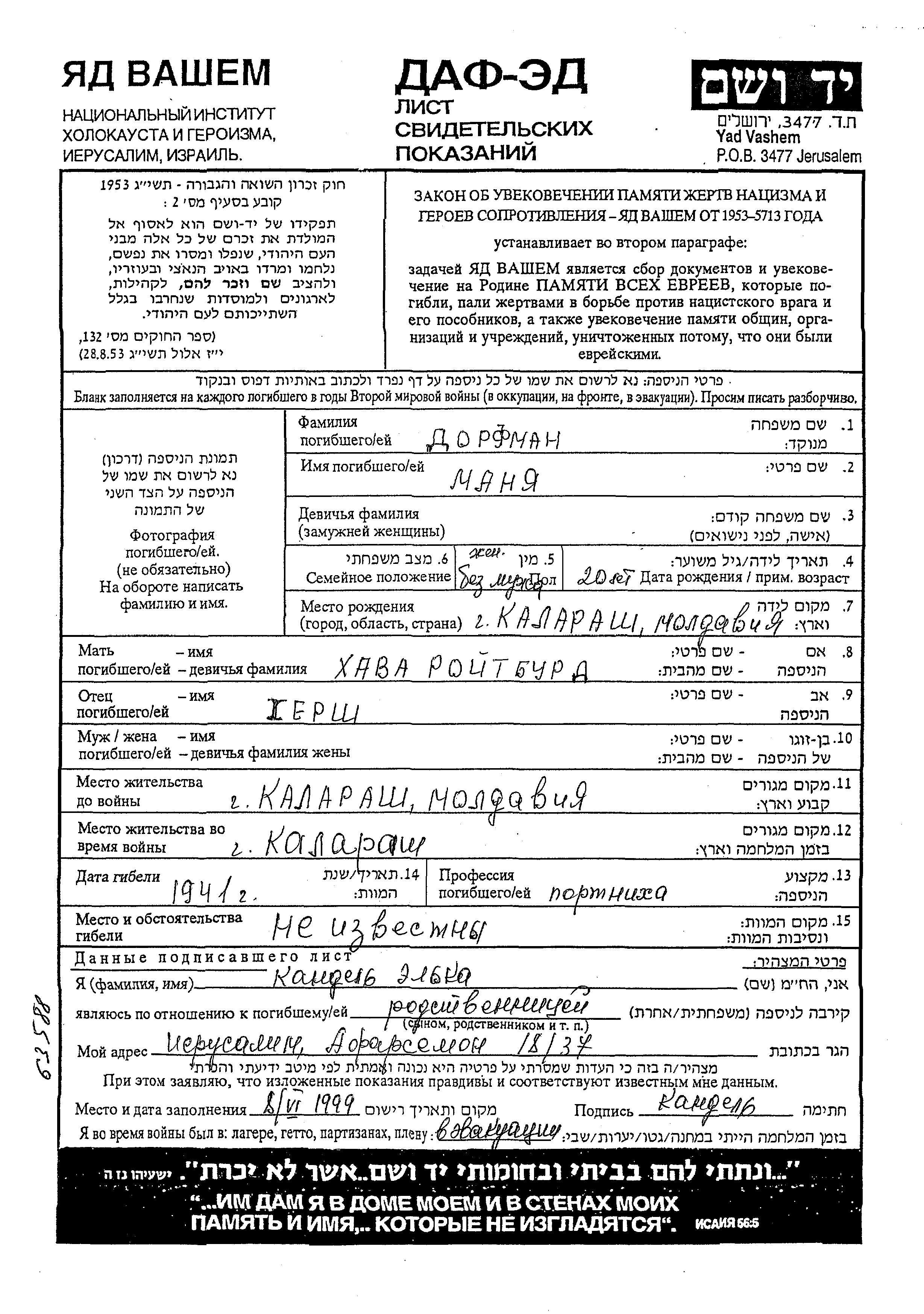 Дорфман Маня Калараш, Румыния Лист свидетельских показаний