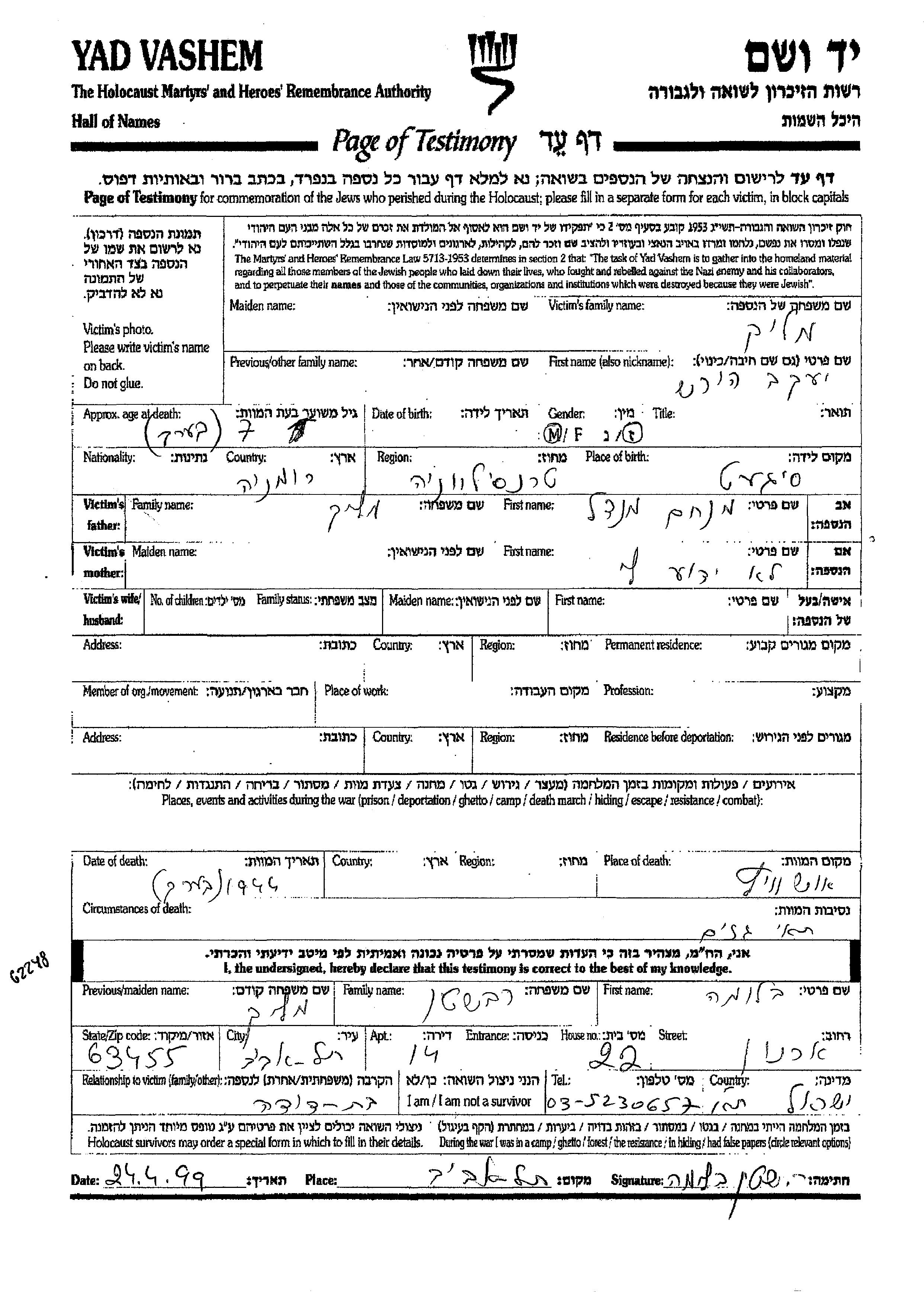 Яд Вашем - Листы свидетельских показаний Мемориального фонда