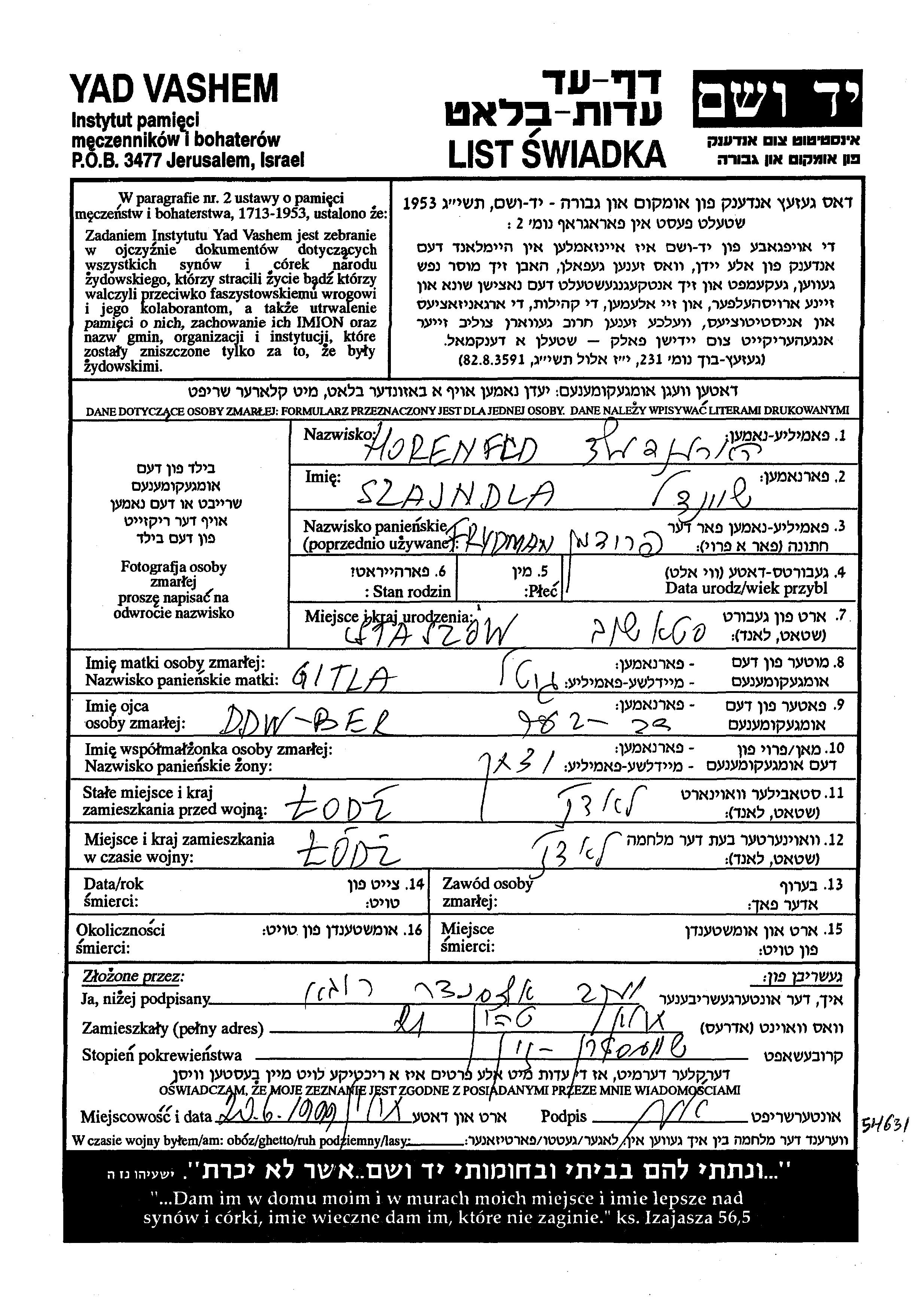 Хорнфельд Шайндла Лодзь, Польша Лист свидетельских показаний