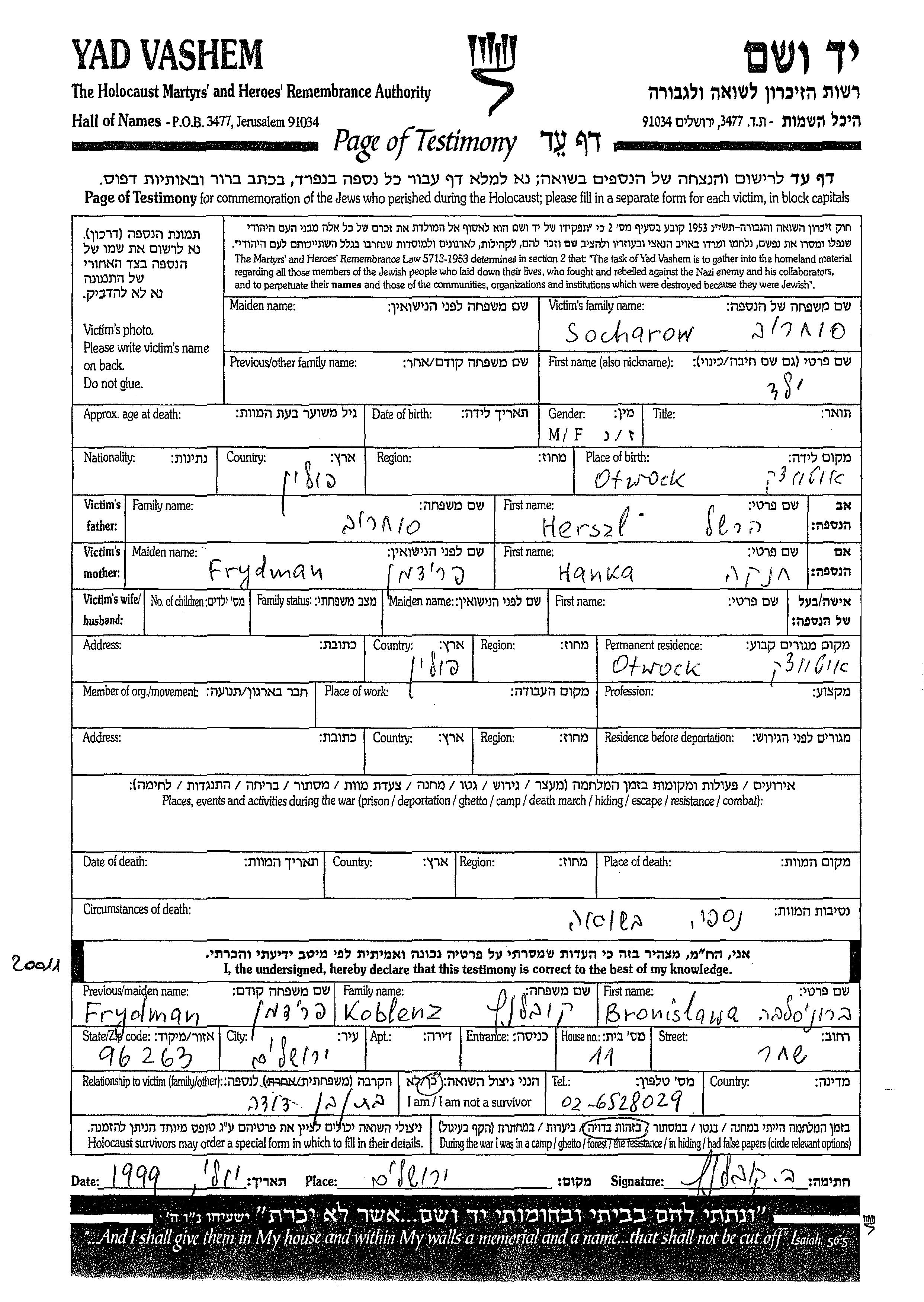 Сохаров Имя неизвестно Отвоцк, Польша Лист свидетельских показаний