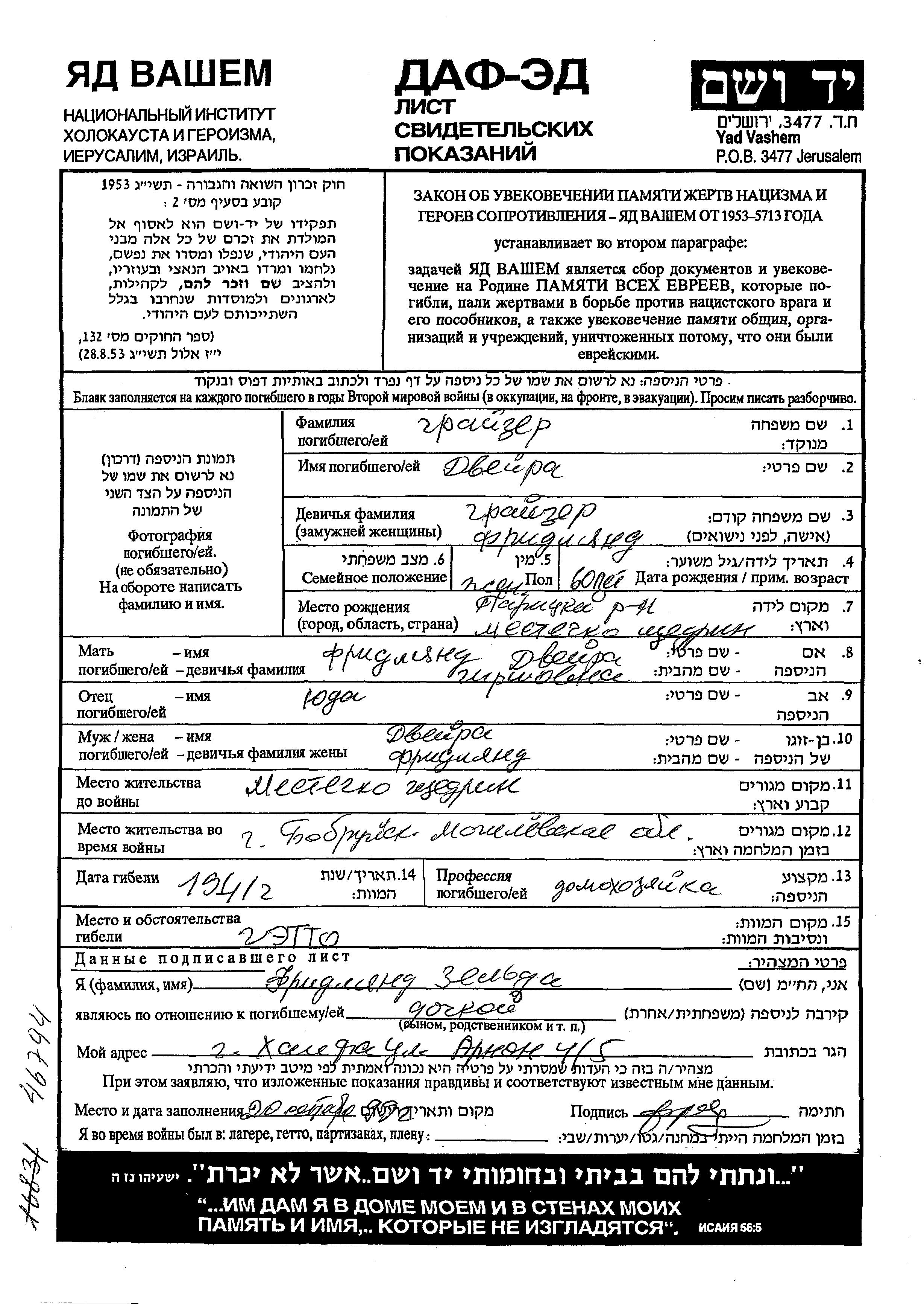 Яд Вашем - Листы свидетельских показаний Мемориального фонда