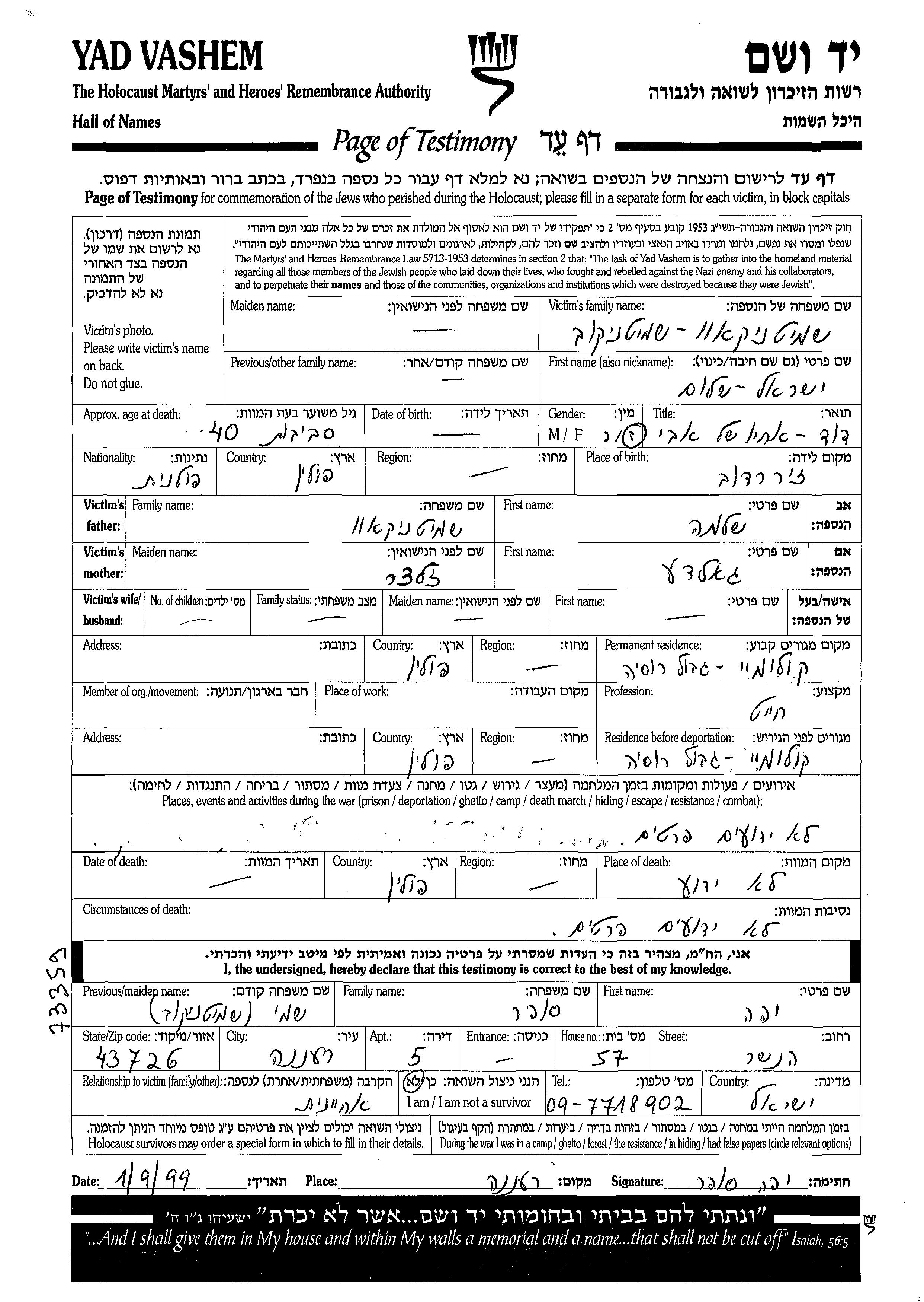 Шмитников Исраэль Коломыя, Польша Лист свидетельских показаний