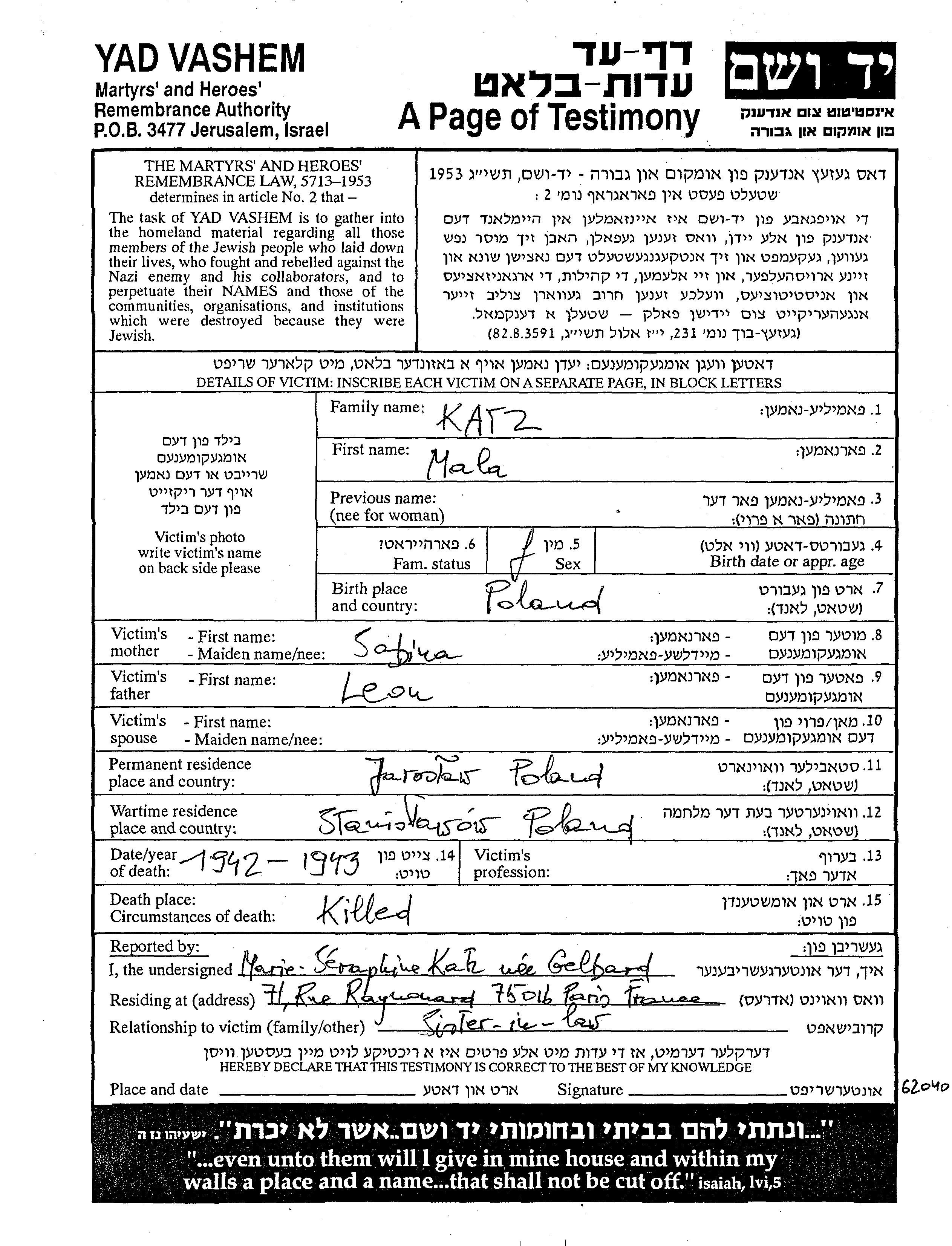 Мала Кац, место рождения: Польша. Отец: Леон, mать:Сафира. Место жительства до войны: Ярослав, Польша. Место во время войны: Станиславув, Польша.