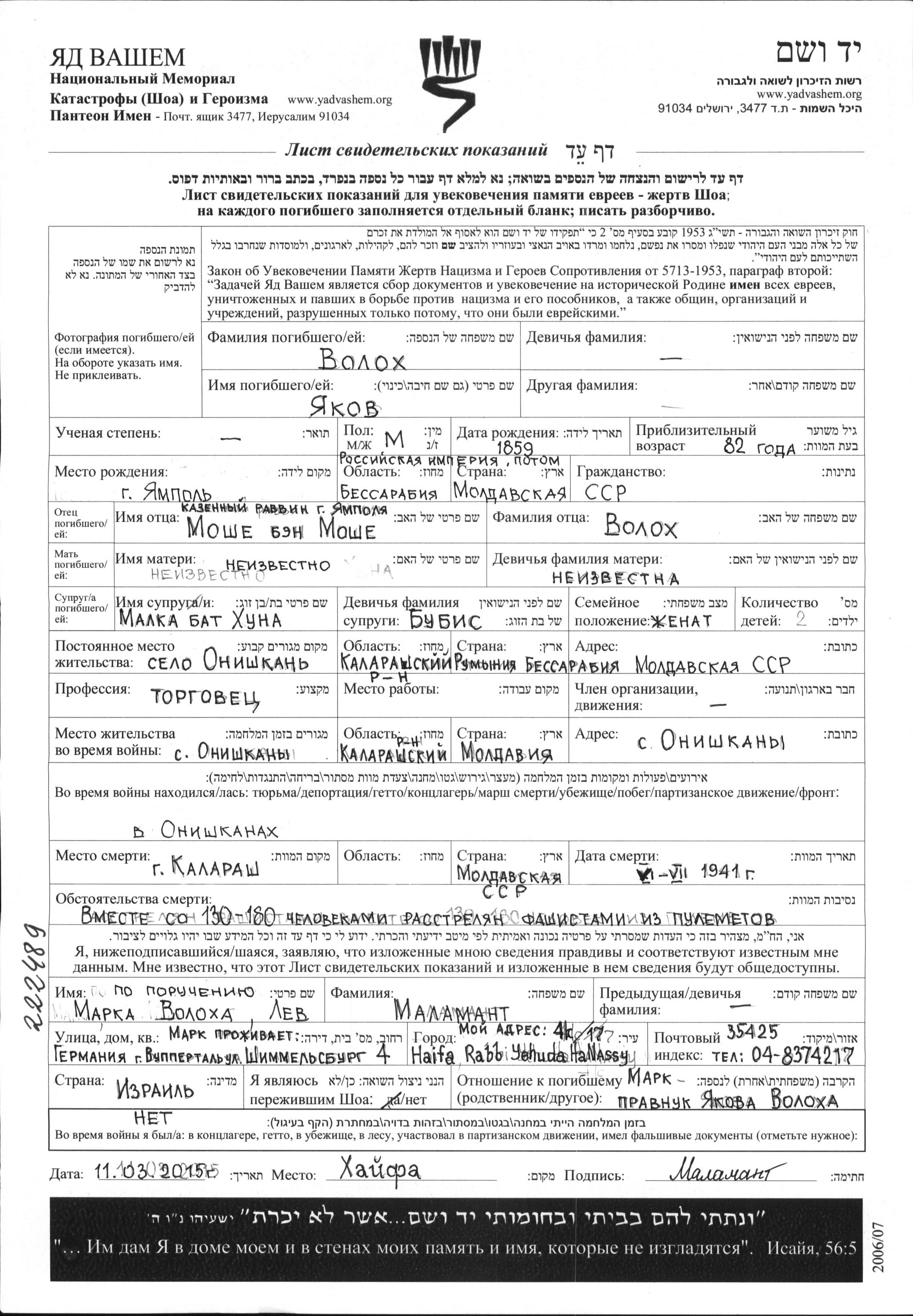 Яков Волох, место рождения: Ямполь, Украина (СССР). Отец: Моше. Торговец / торговка. Женат / замужем. Место жительства до войны: Онишканы, Румыния. Место во время войны: Онишканы, Румыния.