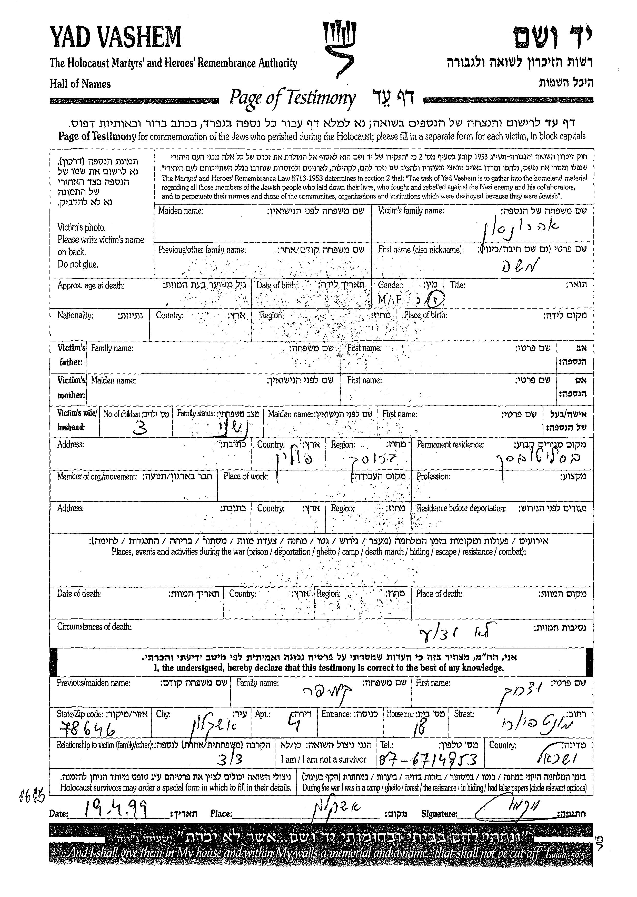 Яд Вашем - Листы свидетельских показаний Мемориального фонда