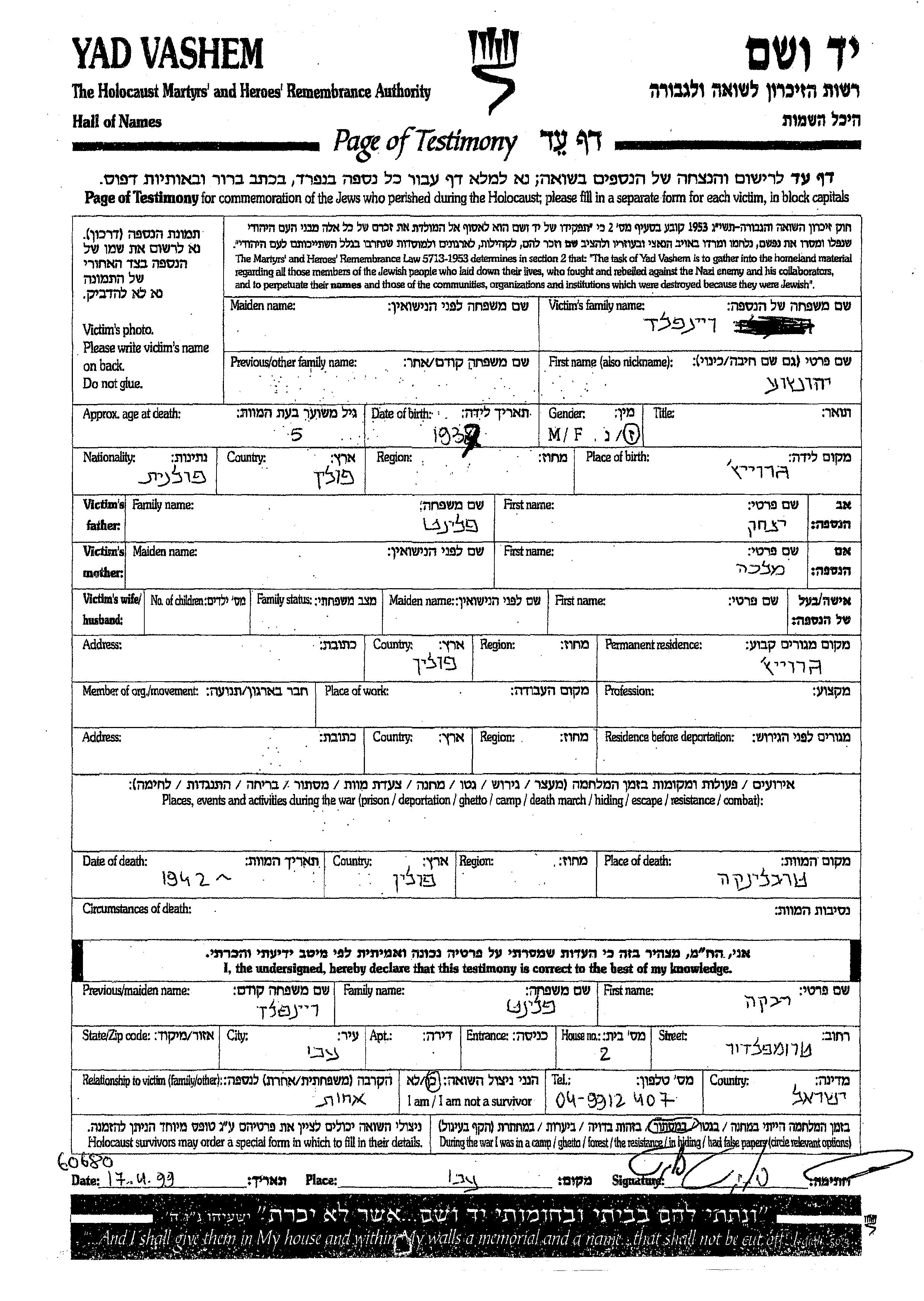 Вейнфельд Флинт Иегошуа 1932 Груец, Польша Лист свидетельских показаний
