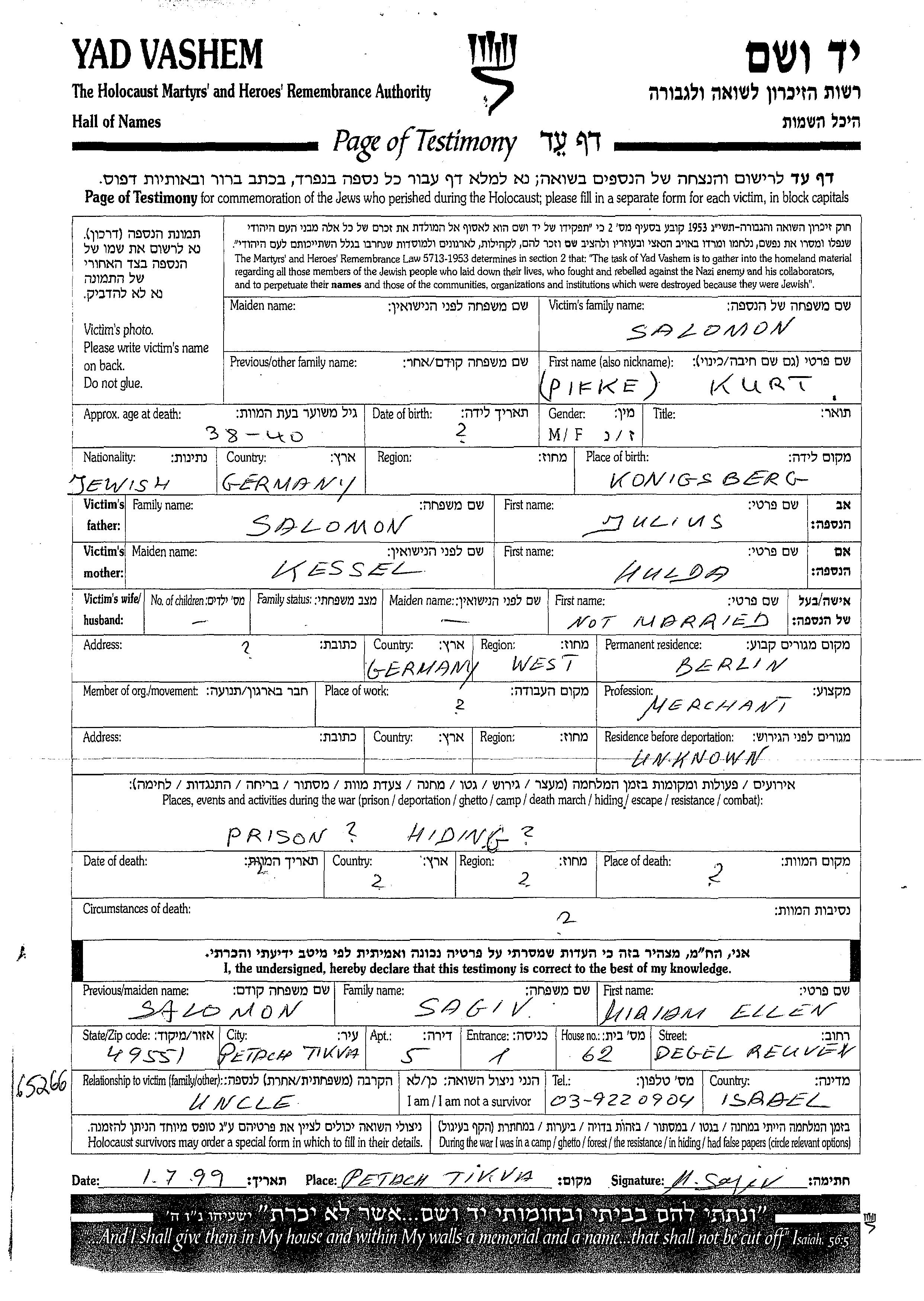 Саломон Курт Берлин, Германия Лист свидетельских показаний