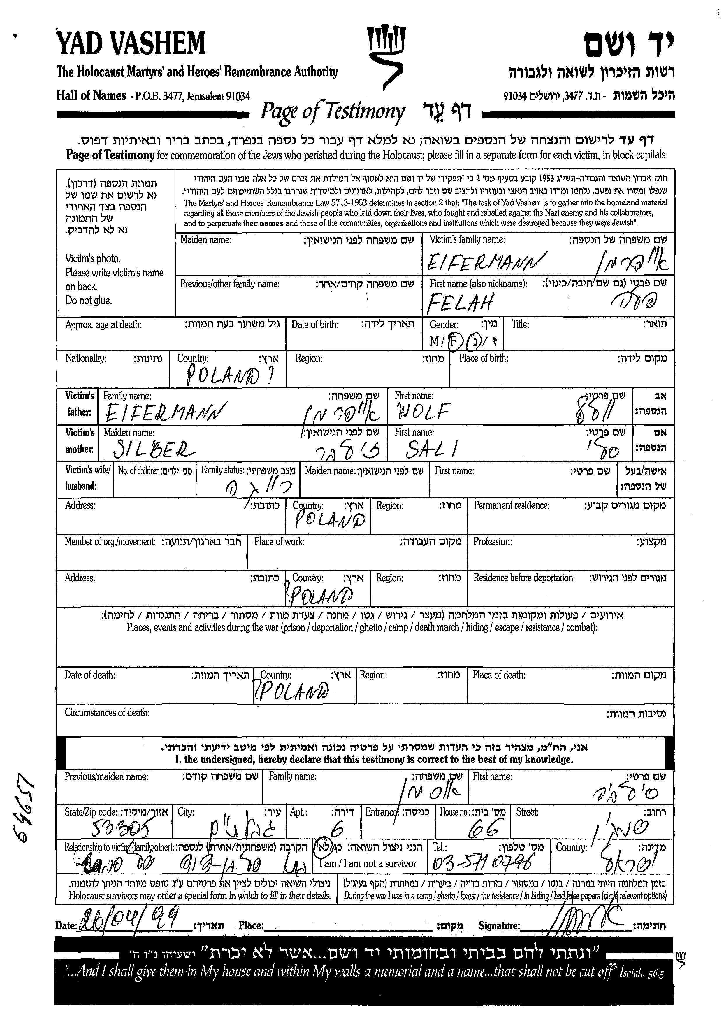 Фела Айферманн, место рождения: Польша. Отец: Вольф, mать:Сали. Холост / не замужем. Место жительства до войны: Польша. Место во время войны: Польша.