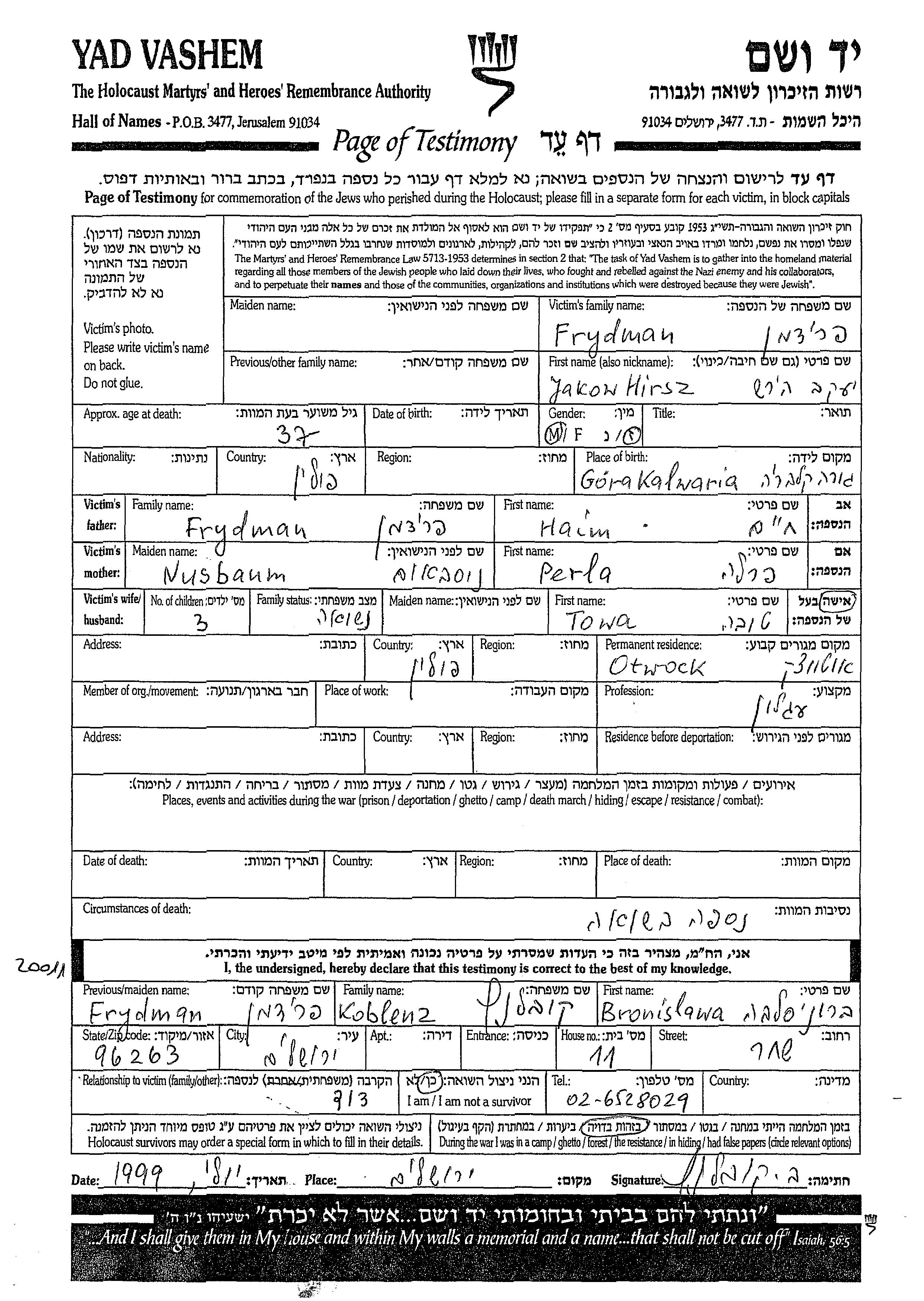 Фридман Яков Хирш Отвоцк, Польша Лист свидетельских показаний