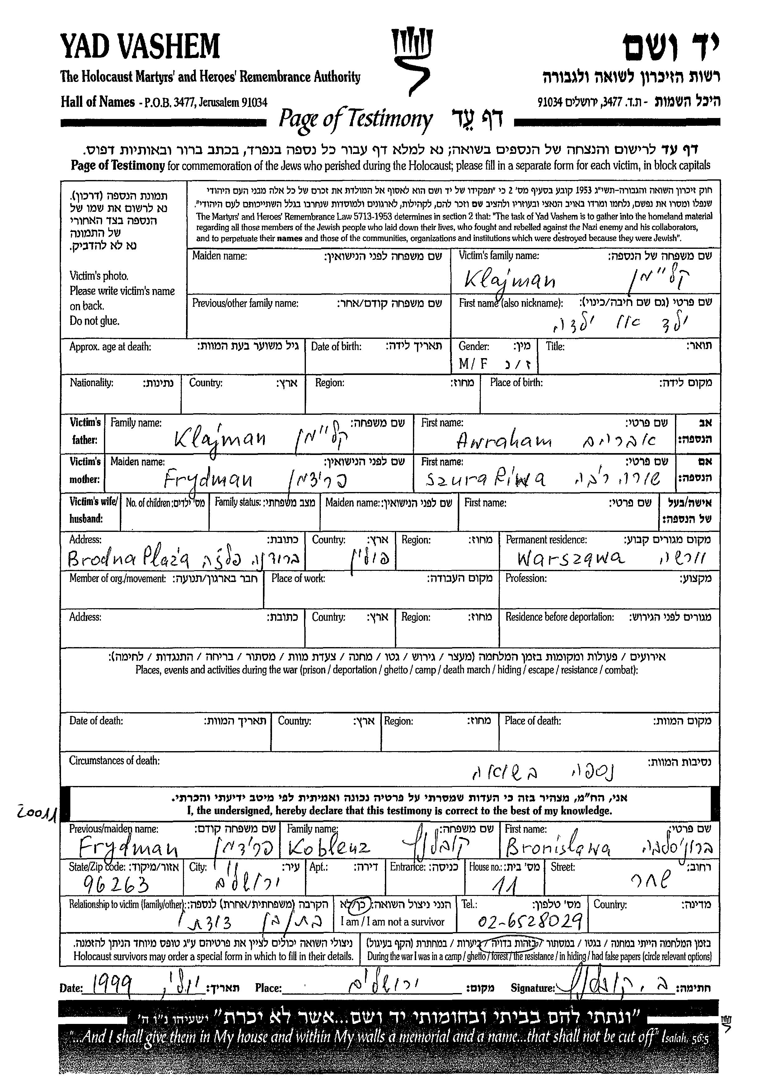 Имя неизвестно Клайман Авраам Шура Рива Шура. Место жительства до войны: Варшава, Польша.