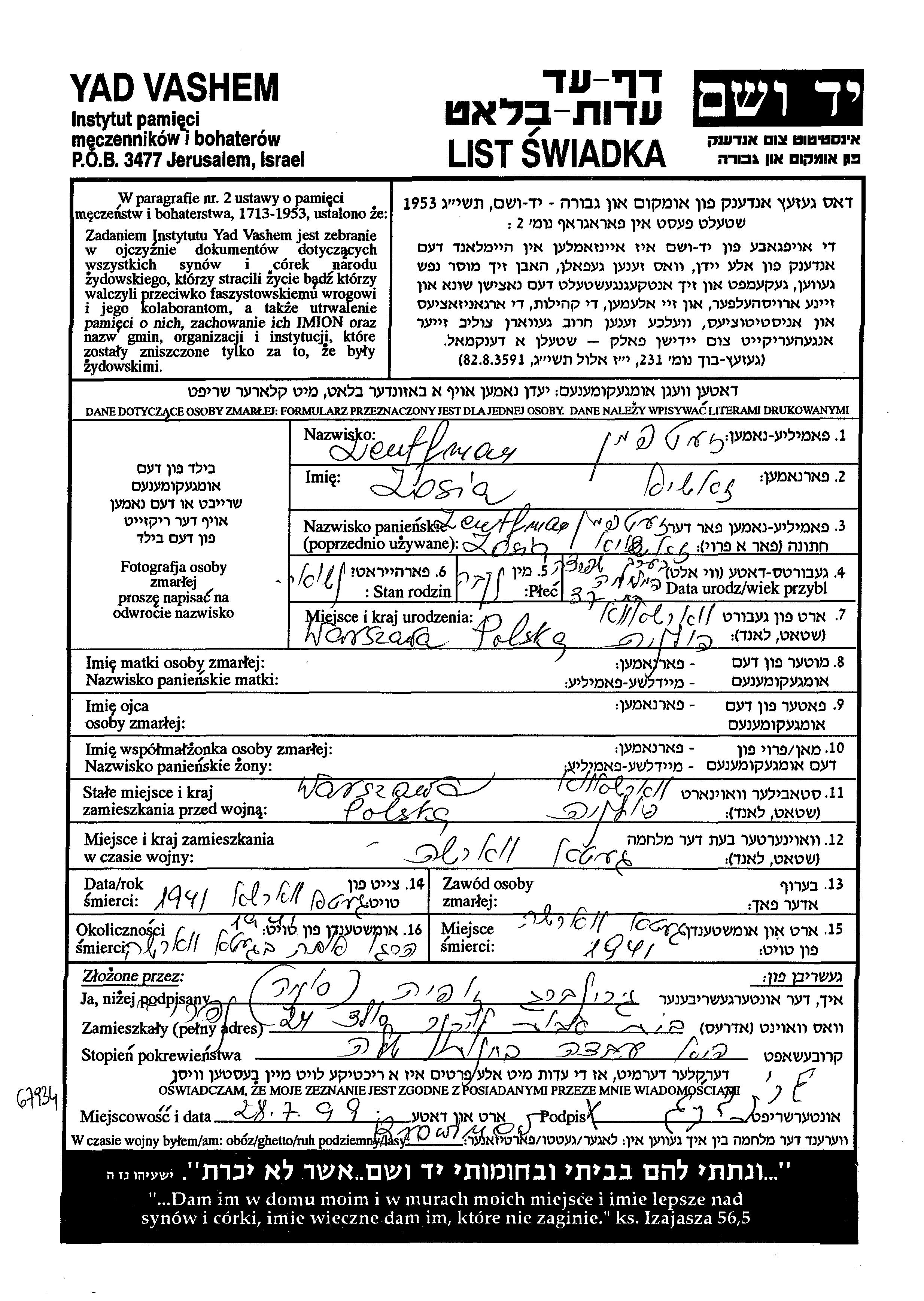 Яд Вашем - Листы свидетельских показаний Мемориального фонда