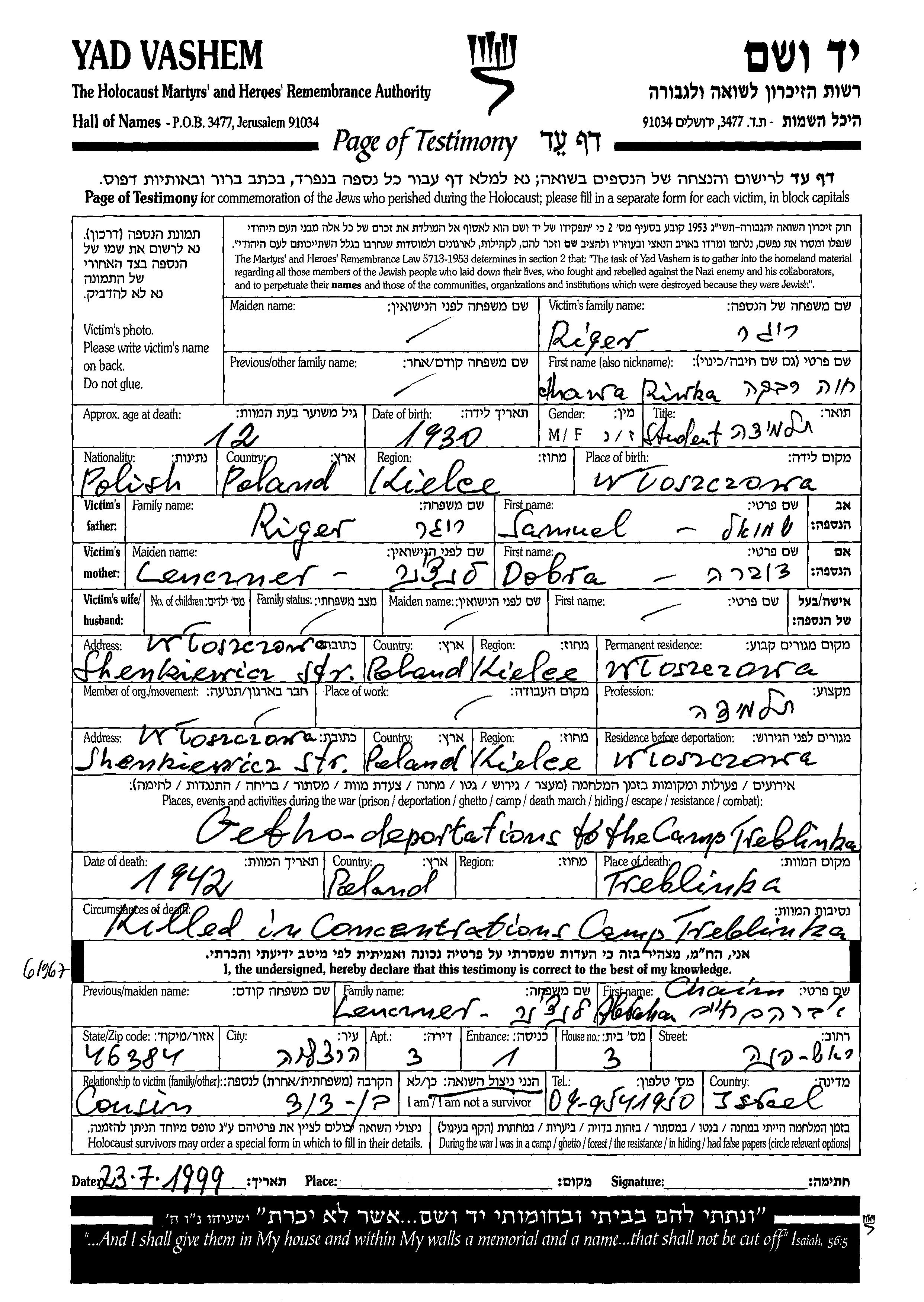Ригер Хава Ривка Хая 1930 Влощова, Польша Лист свидетельских показаний