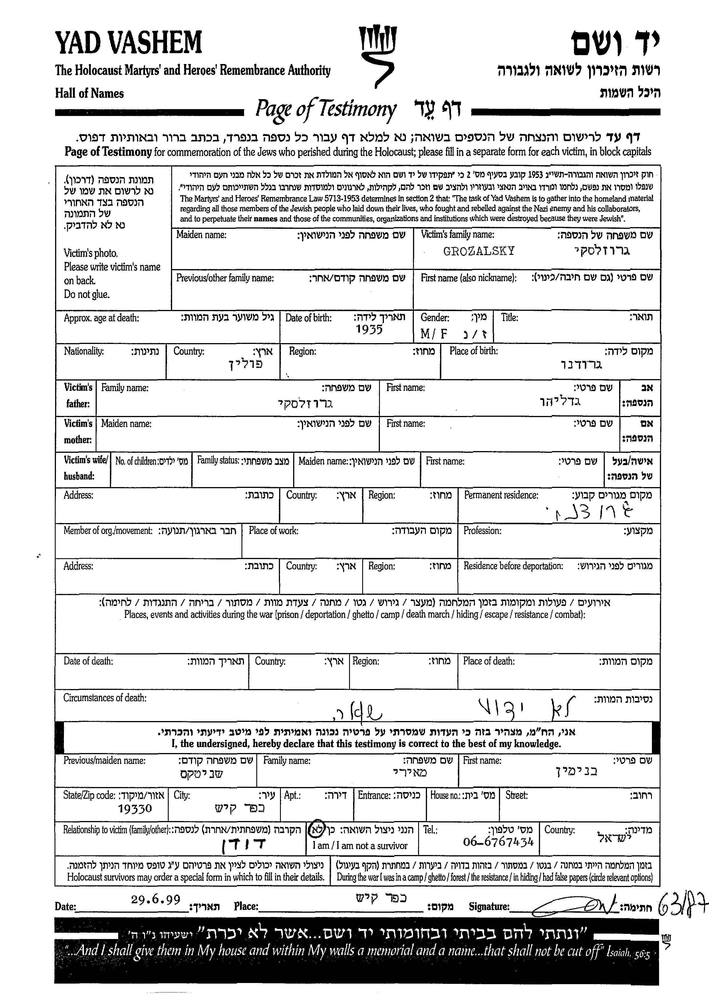 Грозальски Имя неизвестно 1935 Гродно, Польша Лист свидетельских показаний