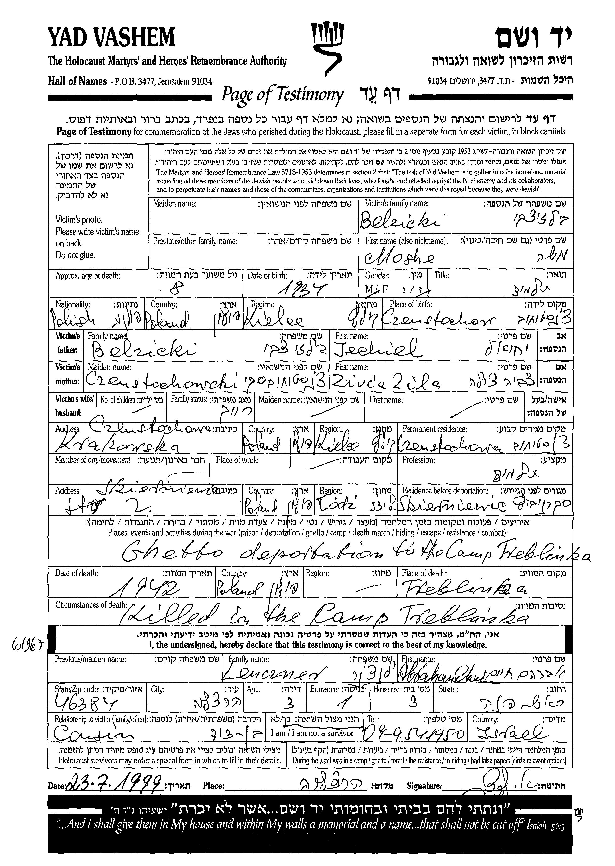 Белзицки Моше 1934 Ченстохова, Польша Лист свидетельских показаний
