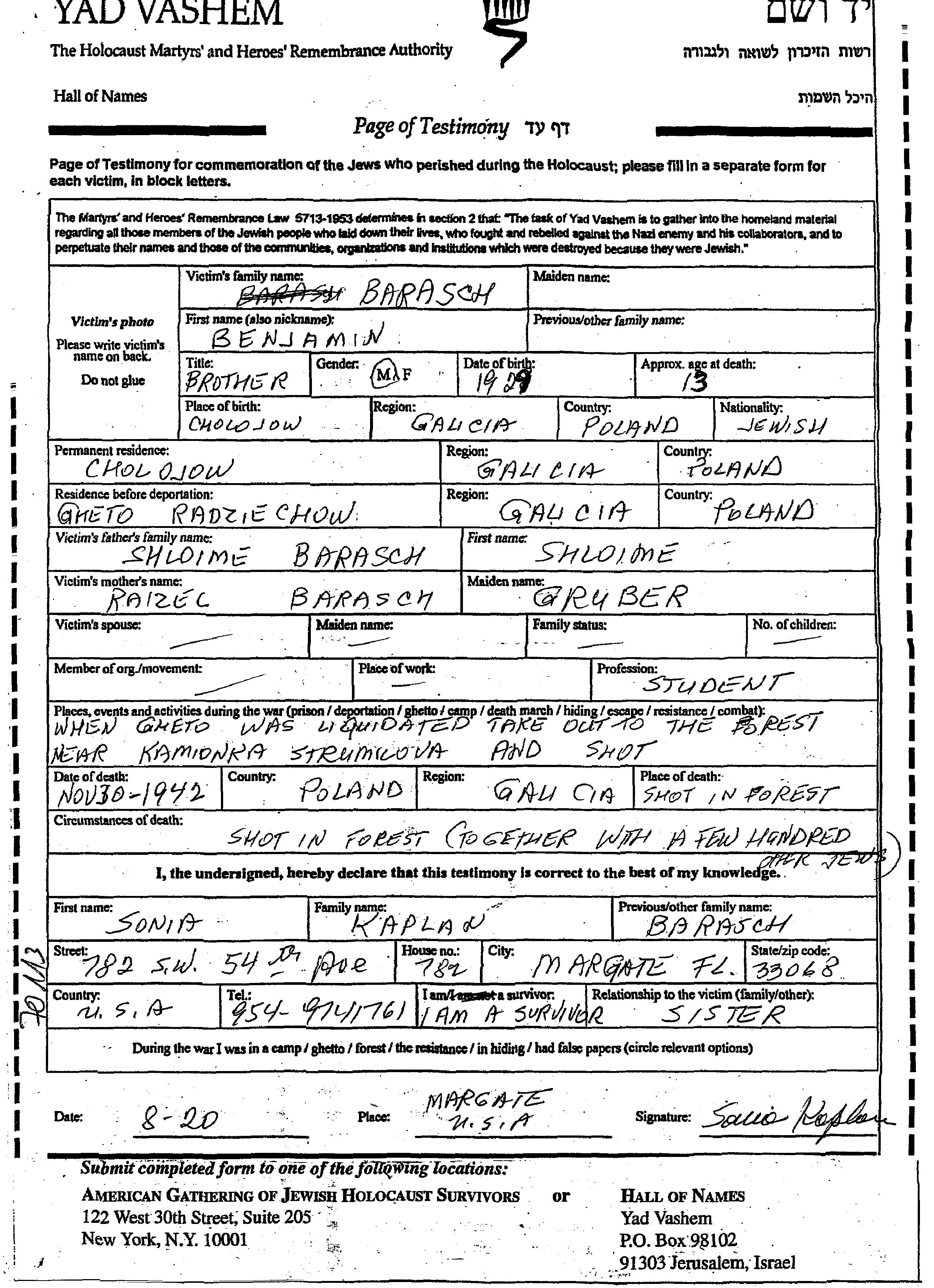 Беньямин Бараш, место рождения: Холоёв, Польша. Отец: Шлойме, mать:Райзел. Студент / студентка. Ребенок. Место жительства до войны: Холоёв, Польша. Место во время войны: Радехов, Польша.