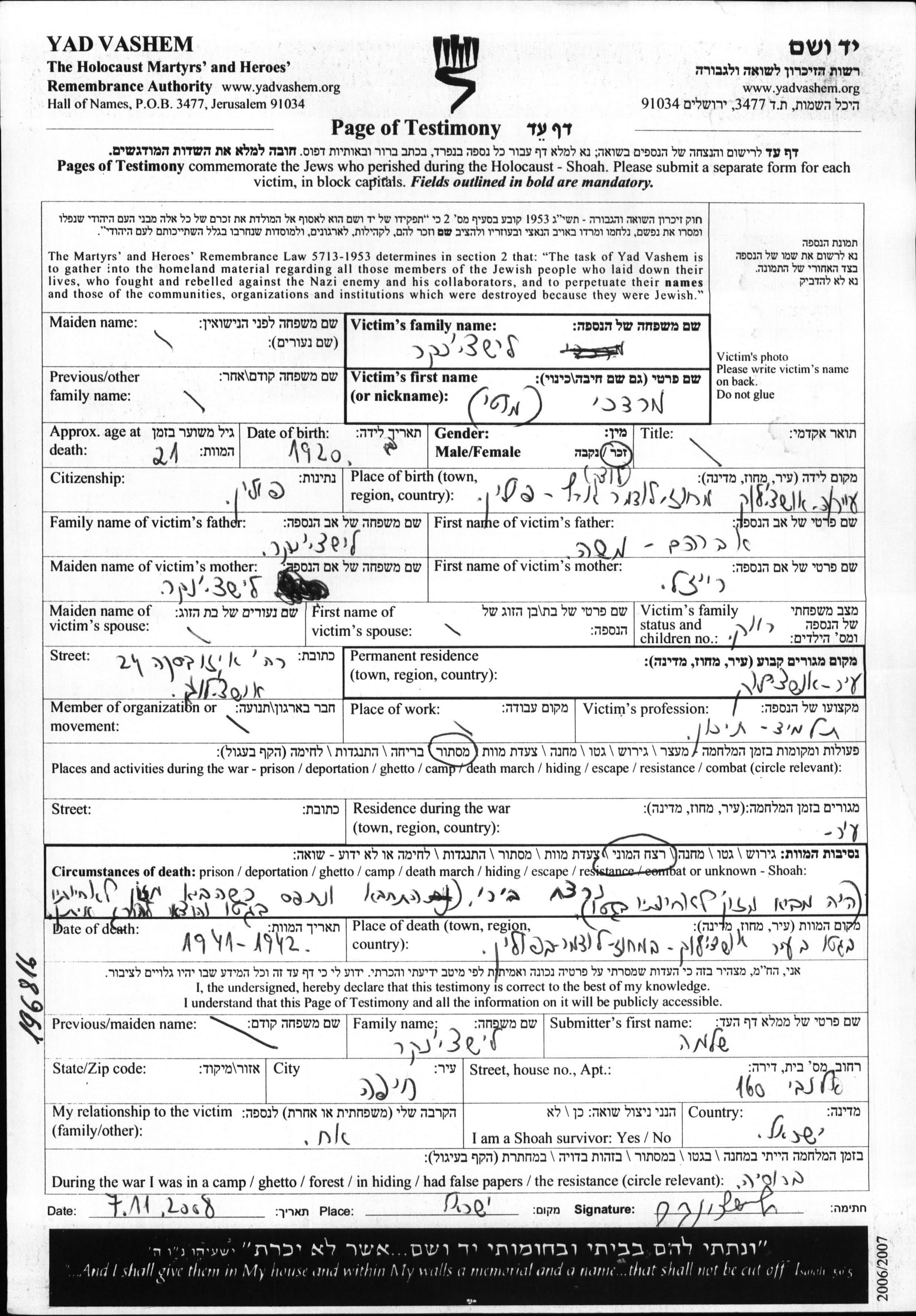 Лищинкер Мордехай 1920 Устилуг, Польша Лист свидетельских показаний